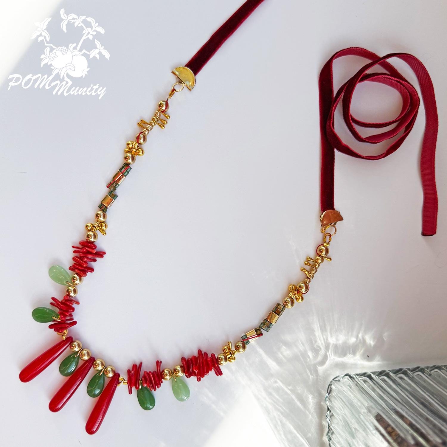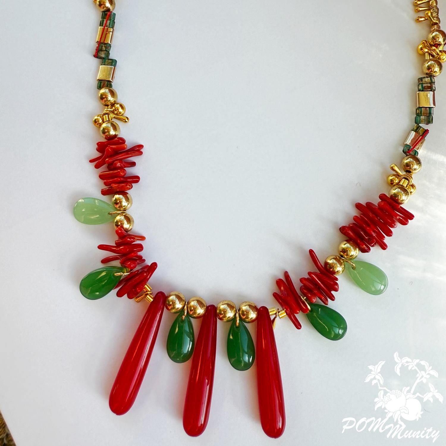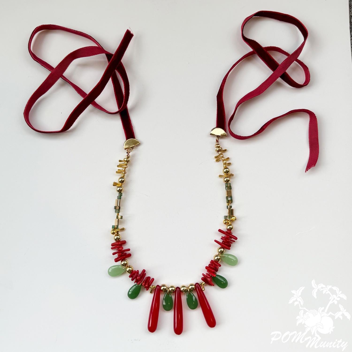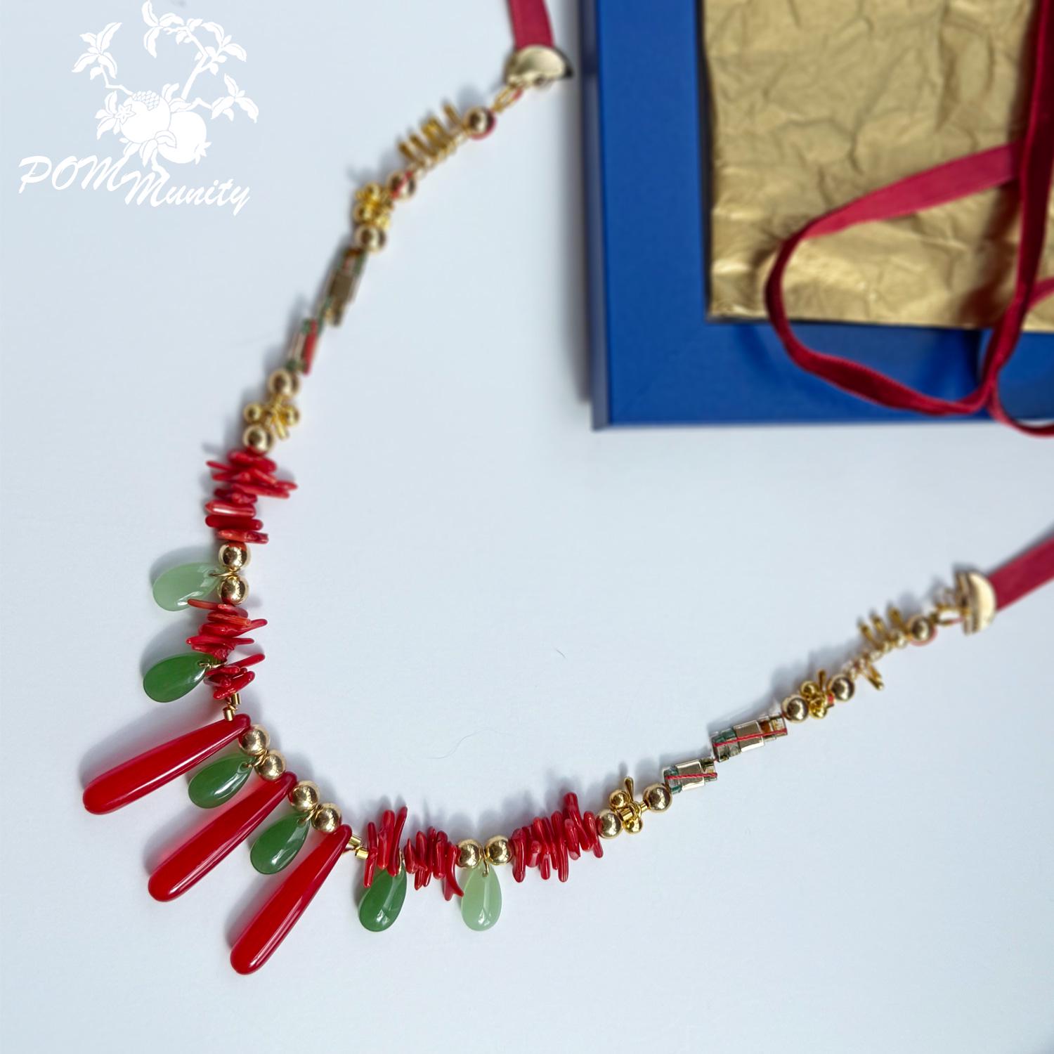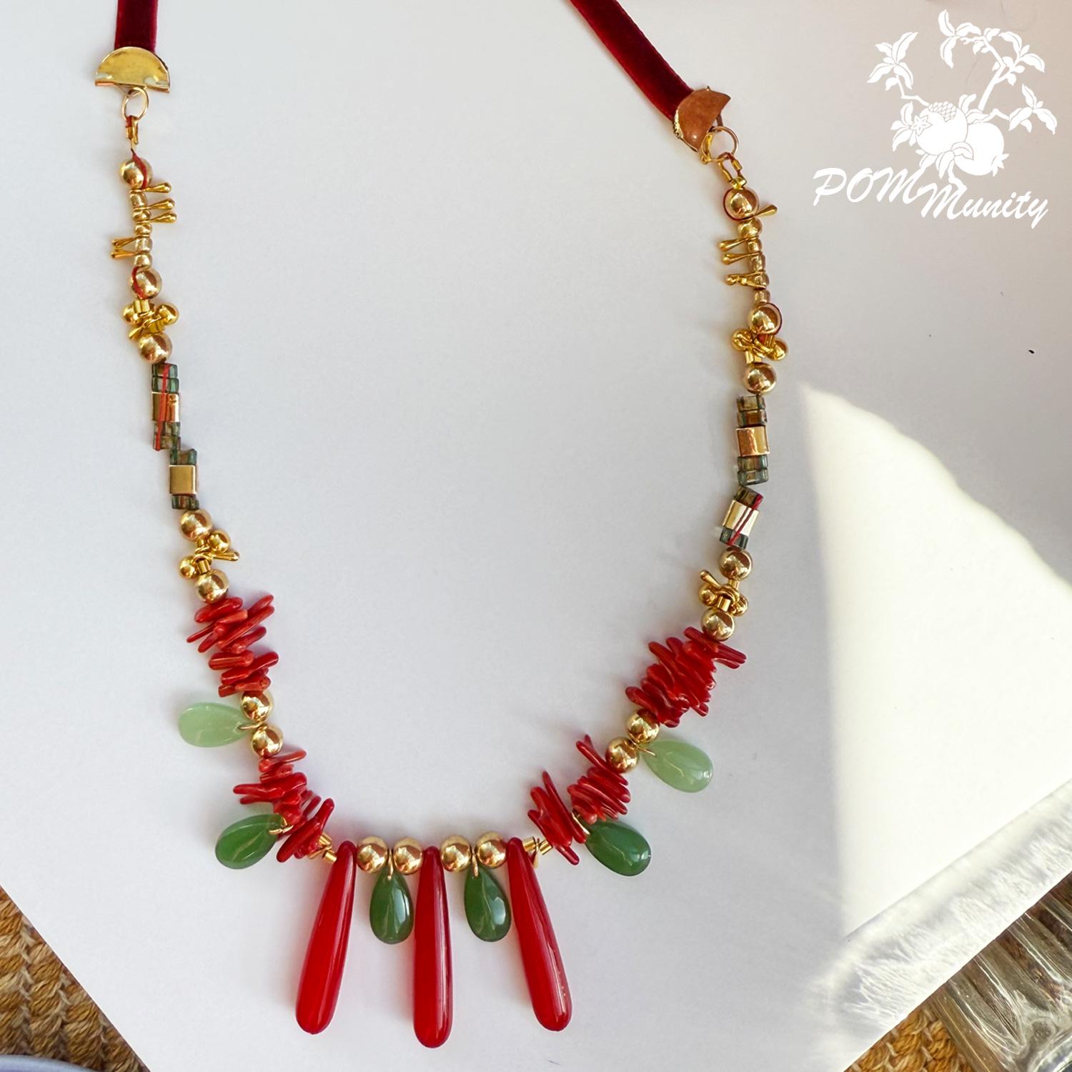 This handmade boho necklace is a bold and artistic accessory, combining textures and colors for a unique statement look. Crafted with green glass jade beads (dark & light), coral vibrant glossy cylindrical beads, and retro artificial red teardrop beads, the design is accented with gold alloy charms, zinc alloy pendants, and stainless steel connectors. The necklace is finished with a 6 mm deep red velvet ribbon closure, giving it a retro-inspired elegance while keeping it lightweight and comfortable. The vibrant mix of green, red, and golden tones makes this necklace ideal for festivals, layering, or as a centerpiece for special occasions. Handmade with love Materials: Glass jade beads (dark & light), coral glossy cylindrical beads, retro red teardrop beads, zinc alloy pendants, gold alloy charms, stainless steel connectors, 6 mm dark red velvet ribbon Adjustable length with ribbon tie Lightweight and durable 🎁 A striking gift for birthdays, anniversaries, or anyone who loves colorful, bohemian jewelry.