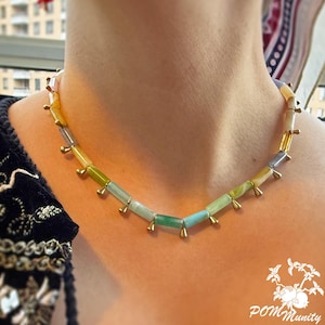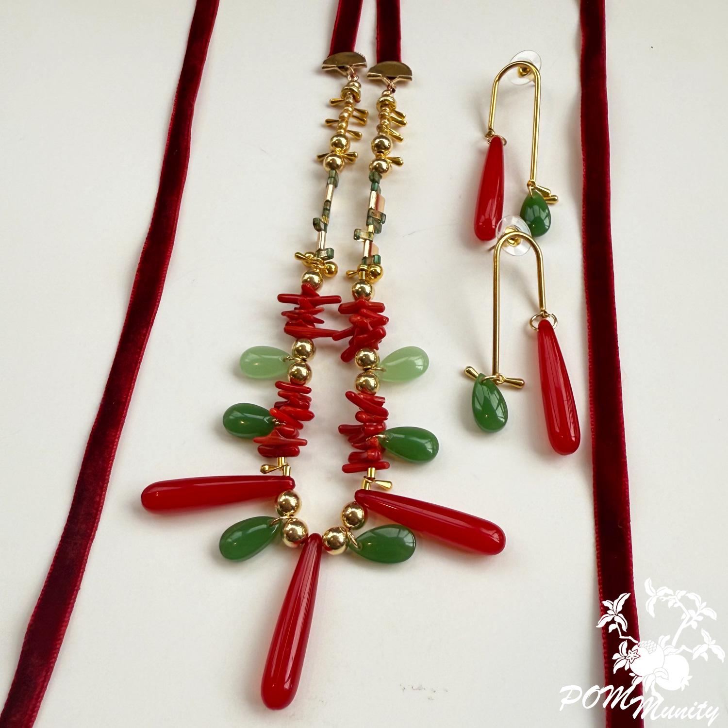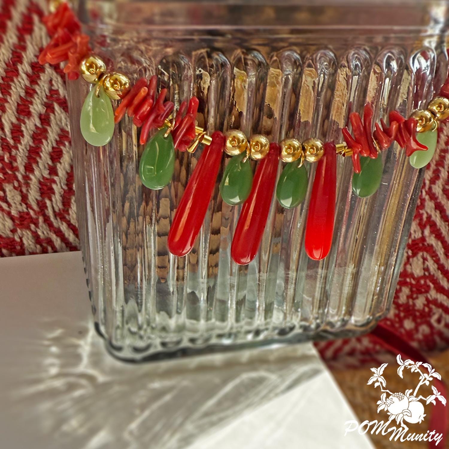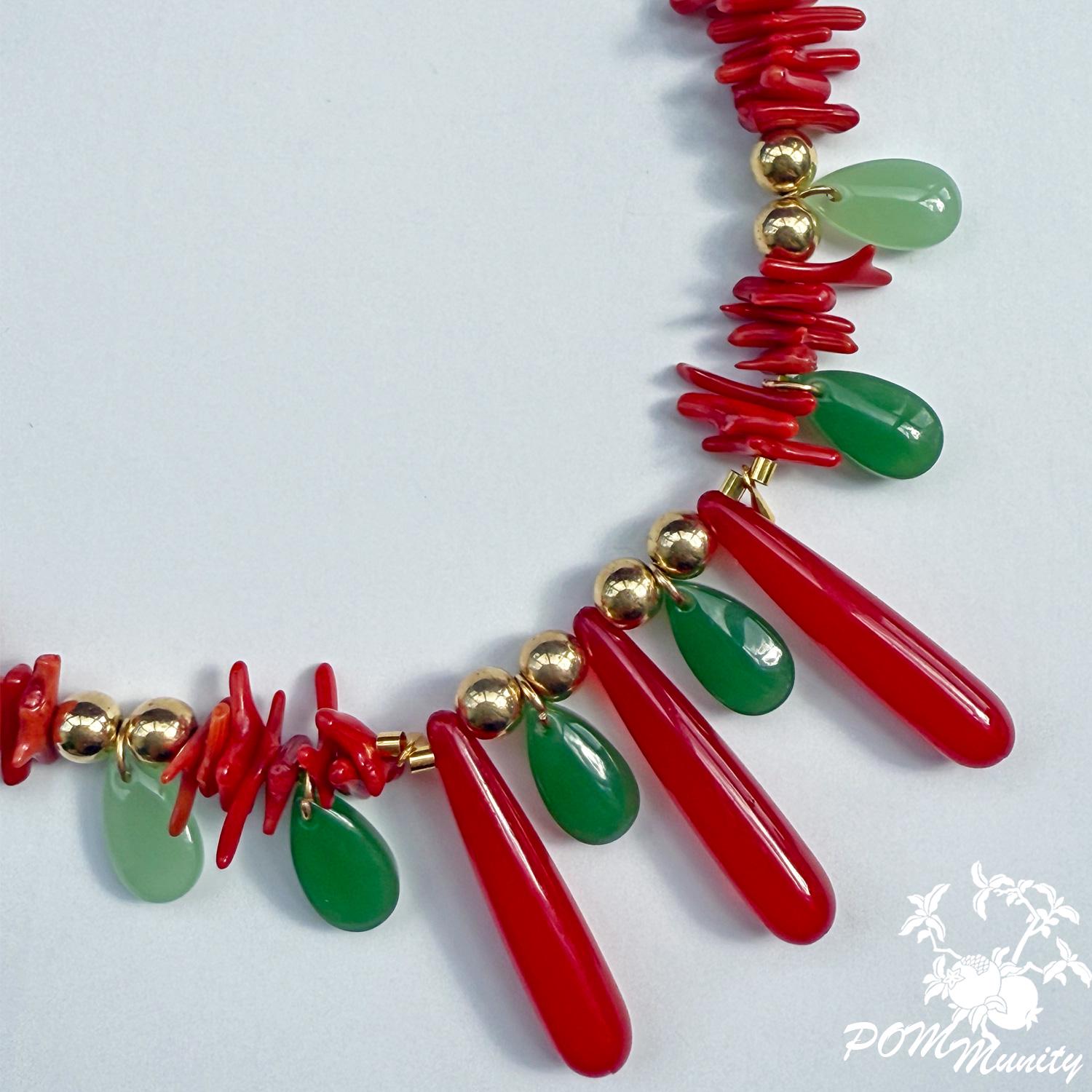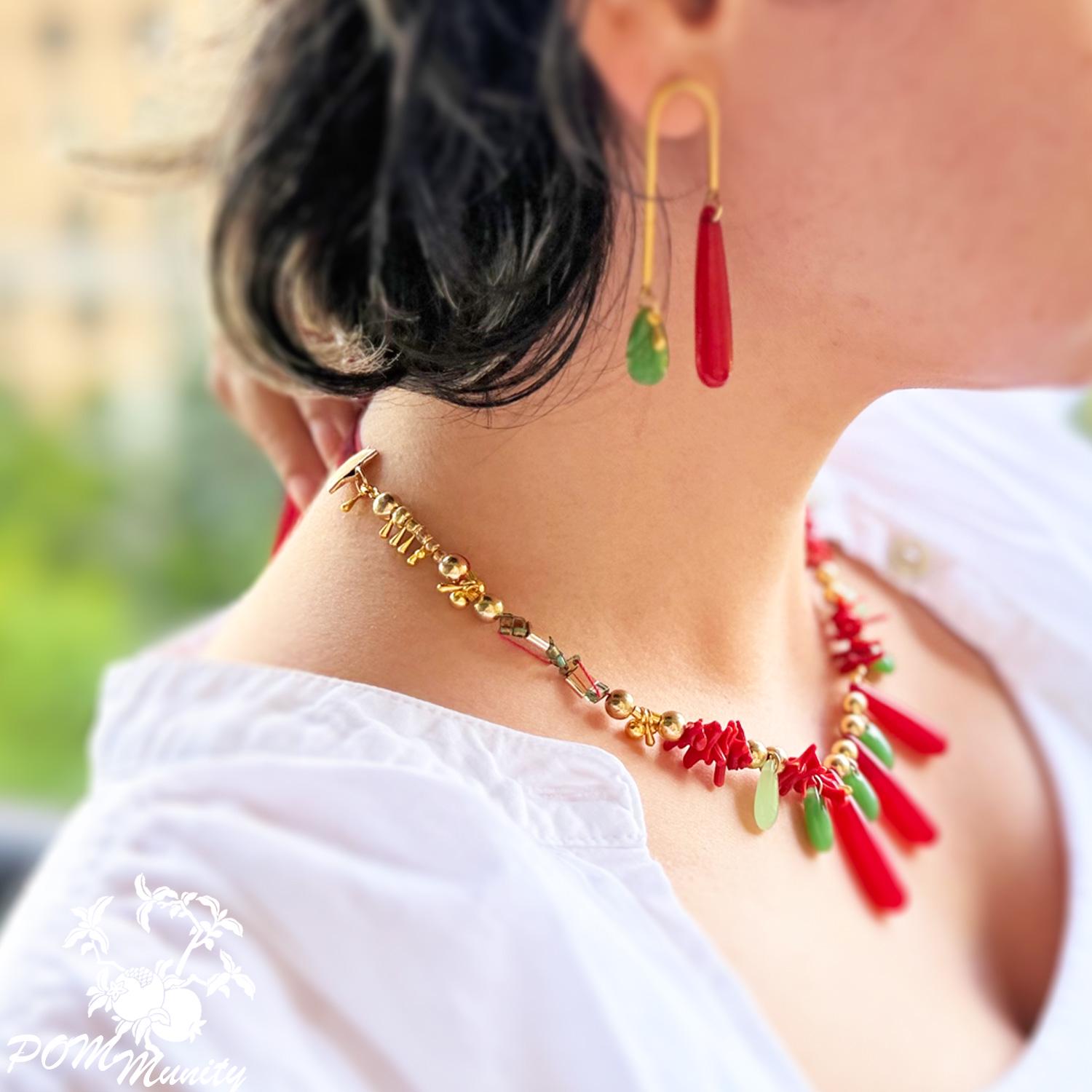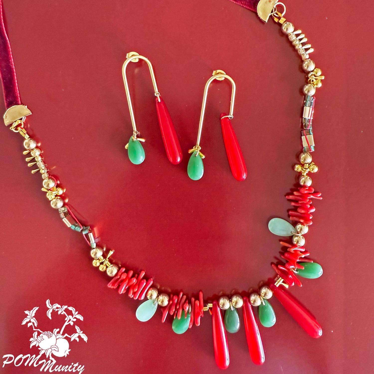 This handmade boho necklace is a bold and artistic accessory, combining textures and colors for a unique statement look. Crafted with green glass jade beads (dark & light), coral vibrant glossy cylindrical beads, and retro artificial red teardrop beads, the design is accented with gold alloy charms, zinc alloy pendants, and stainless steel connectors. The necklace is finished with a 6 mm deep red velvet ribbon closure, giving it a retro-inspired elegance while keeping it lightweight and comfortable. The vibrant mix of green, red, and golden tones makes this necklace ideal for festivals, layering, or as a centerpiece for special occasions. Handmade with love Materials: Glass jade beads (dark & light), coral glossy cylindrical beads, retro red teardrop beads, zinc alloy pendants, gold alloy charms, stainless steel connectors, 6 mm dark red velvet ribbon Adjustable length with ribbon tie Lightweight and durable 🎁 A striking gift for birthdays, anniversaries, or anyone who loves colorful, bohemian jewelry.