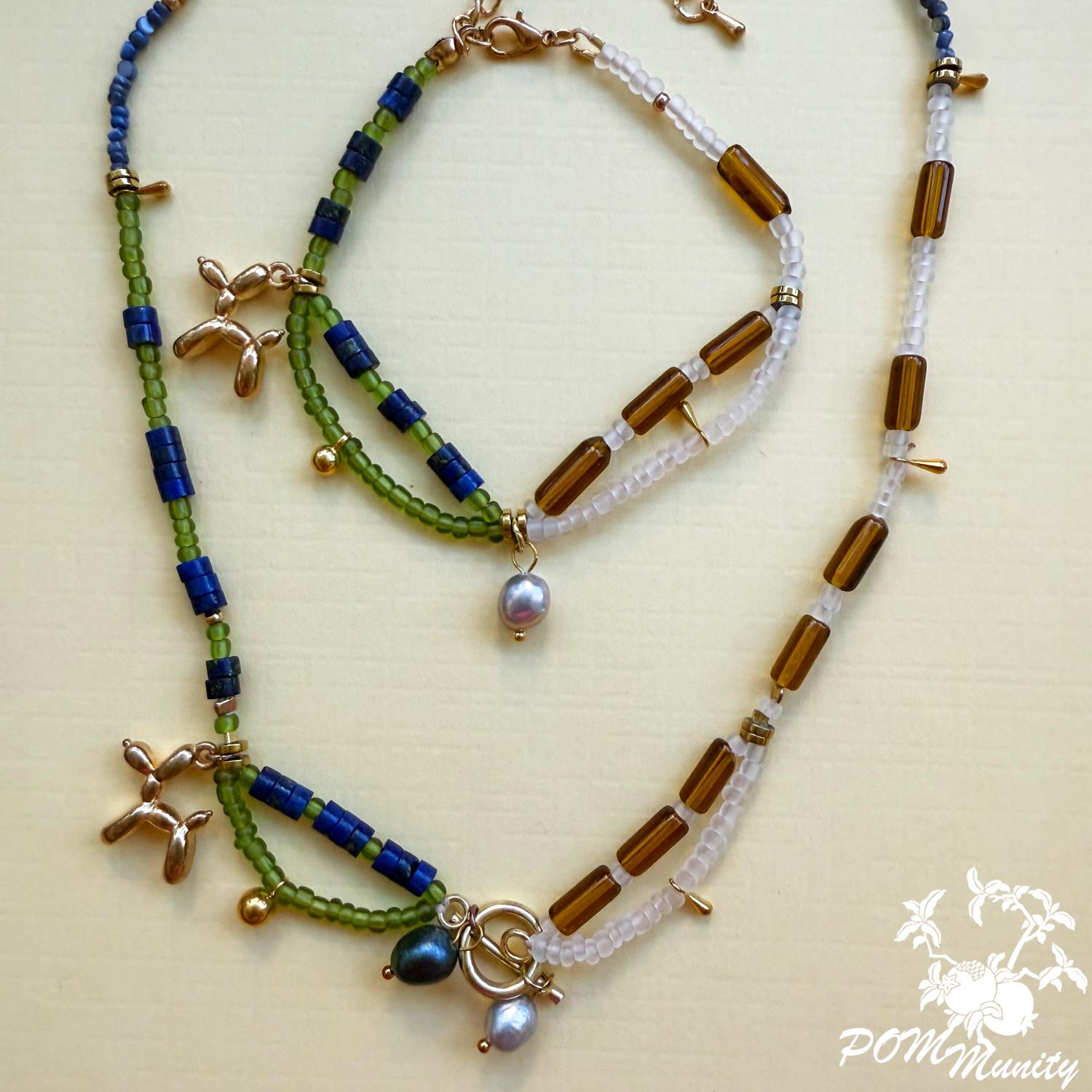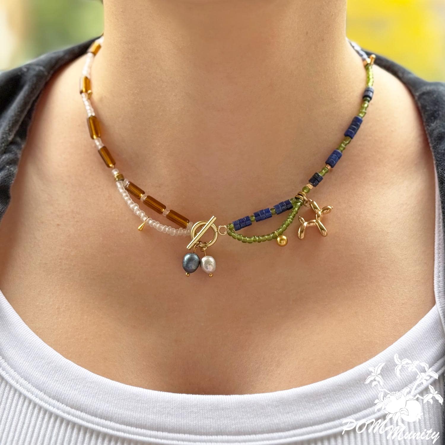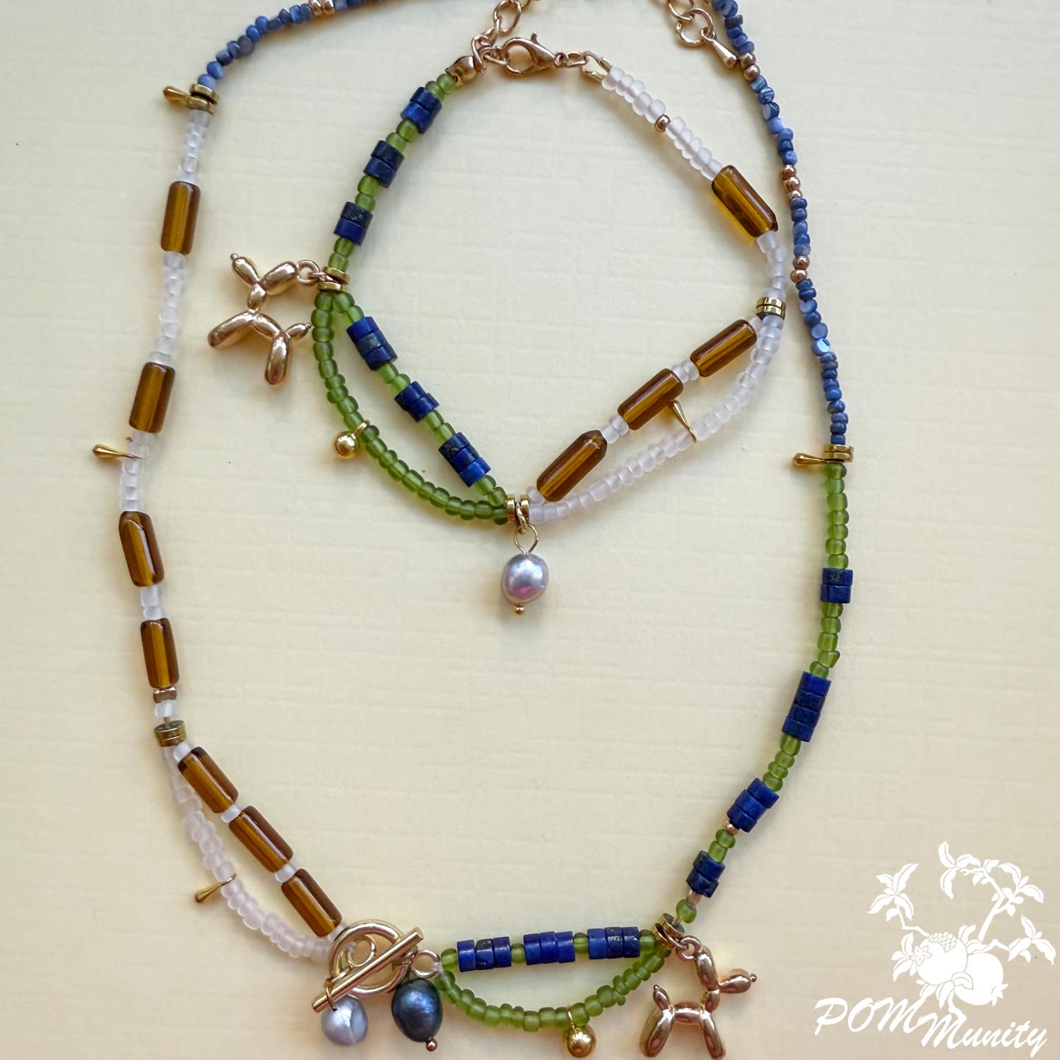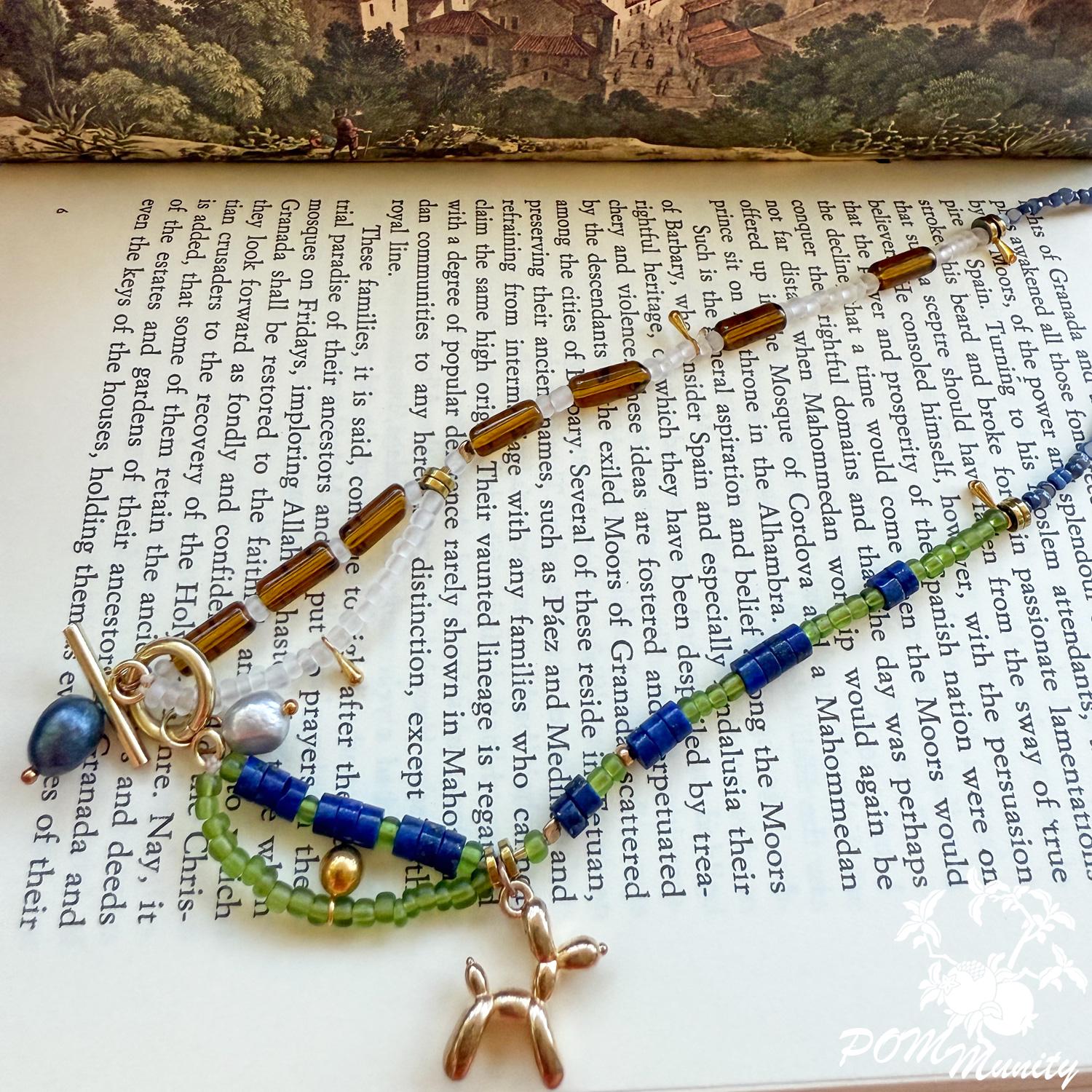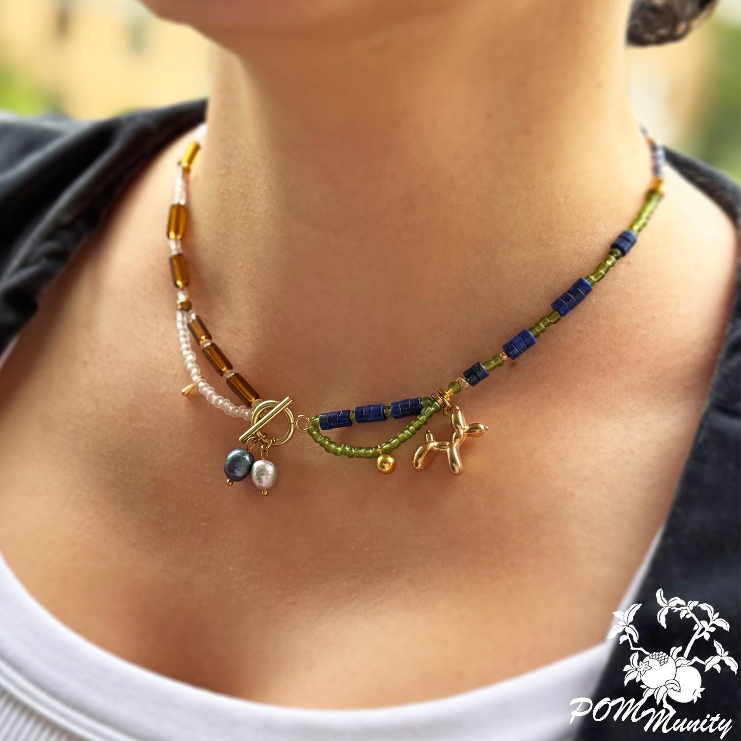 Finished with golden brass details and a 3D balloon dog charm in zinc alloy, this piece bridges playful art and modern boho style. Lightweight yet full of character, it’s a perfect accessory for both everyday wear and special occasions. Handmade with love ✨ Materials: Natural lapis lazuli beads, freshwater pearls, transparent matte glass seed beads, transparent acrylic beads, natural shell beads, zinc alloy balloon dog charm, golden brass findings Length: 41 Cm (16") Lightweight and durable 🎁 A thoughtful gift for art lovers, birthdays, or anyone who enjoys playful, handcrafted jewelry.