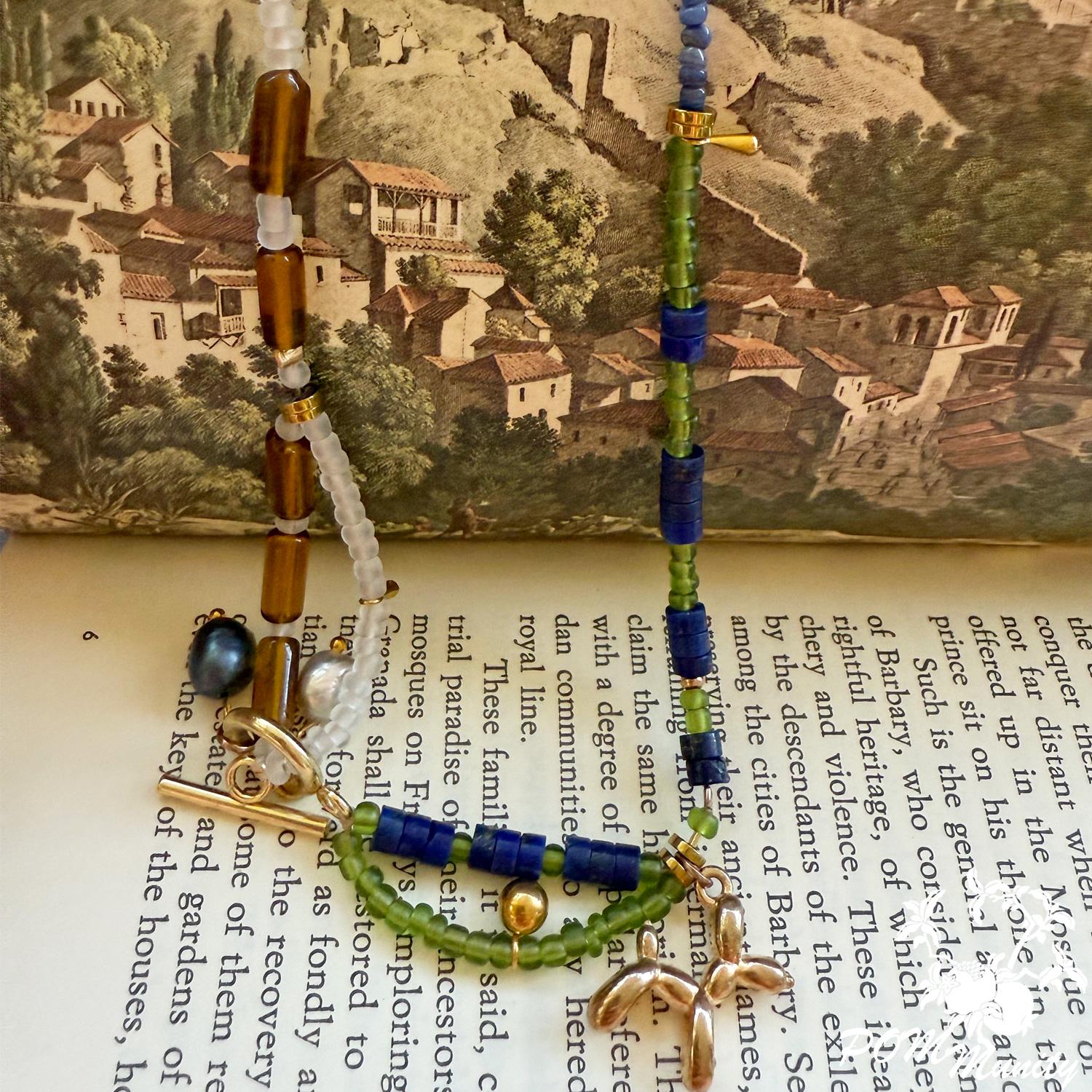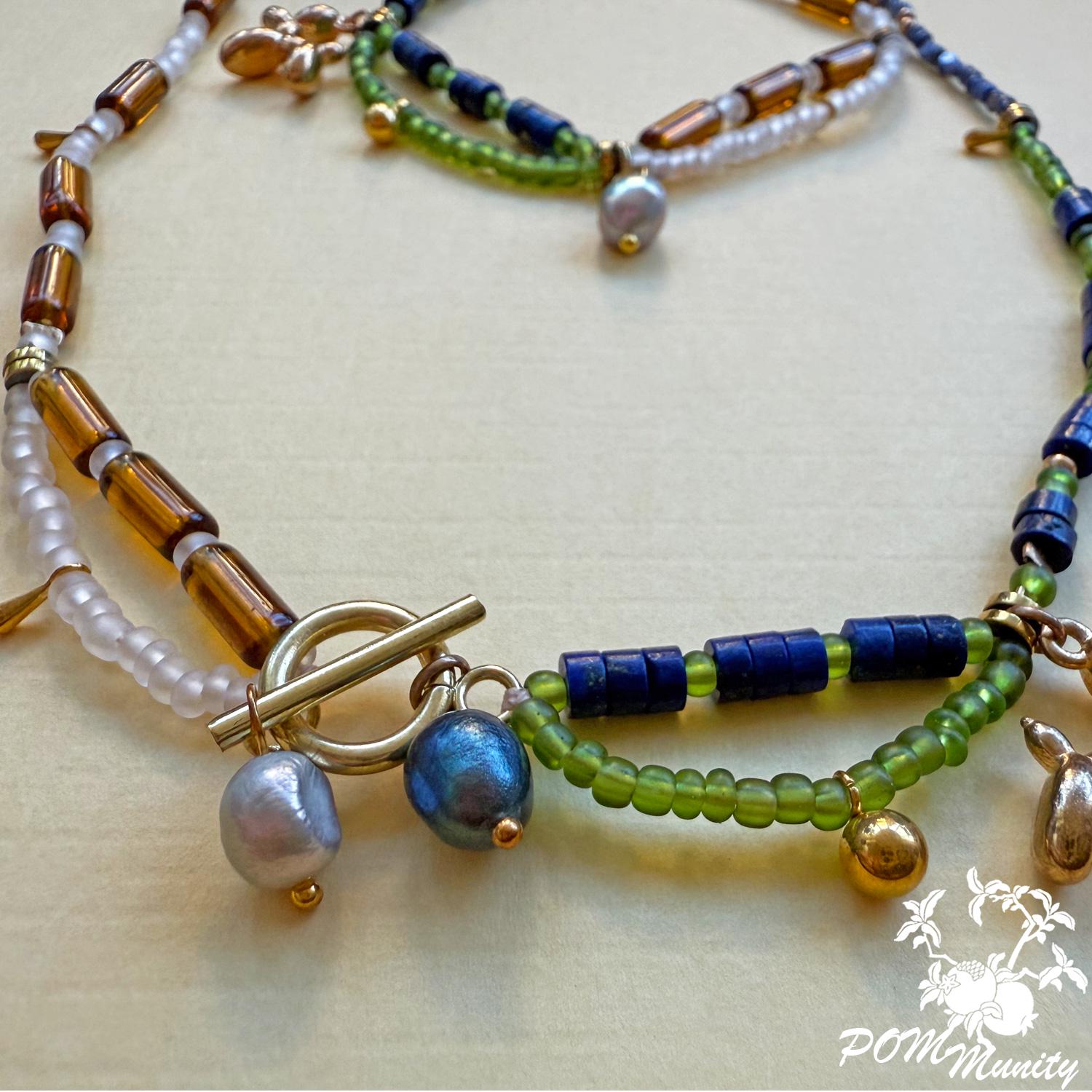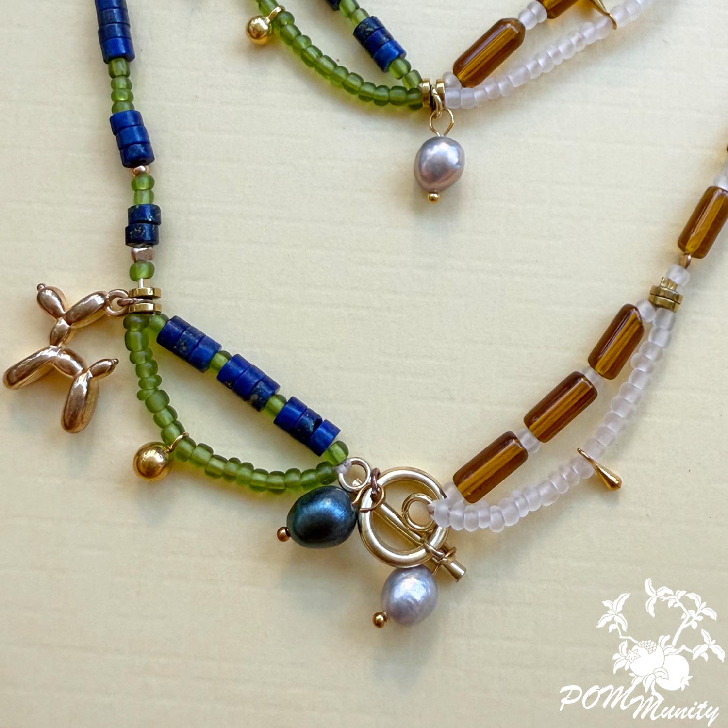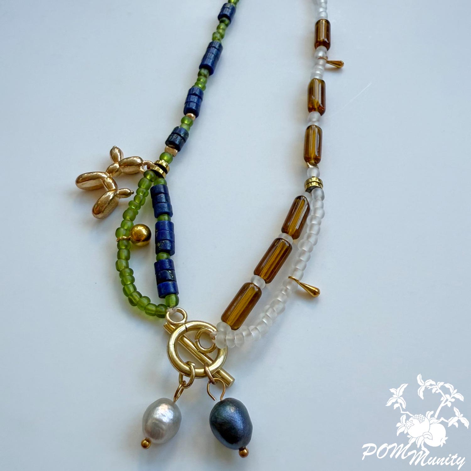 This handmade necklace combines elegance and whimsy with a creative mix of natural lapis lazuli, freshwater pearls, transparent matte glass beads, acrylic beads, and shell accents.