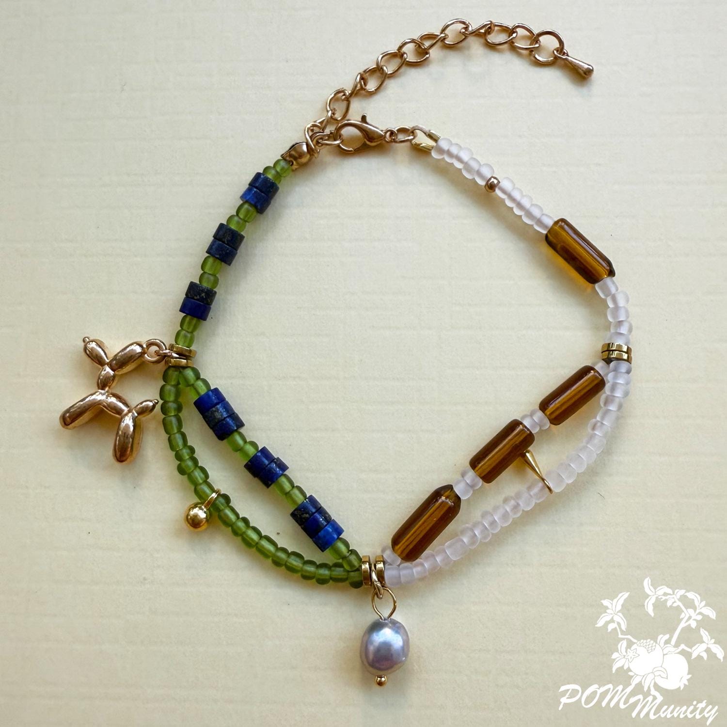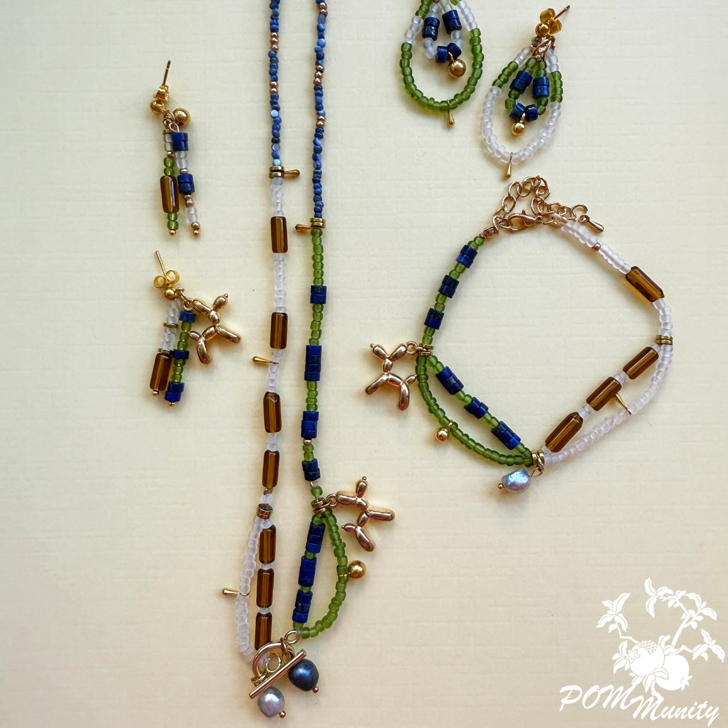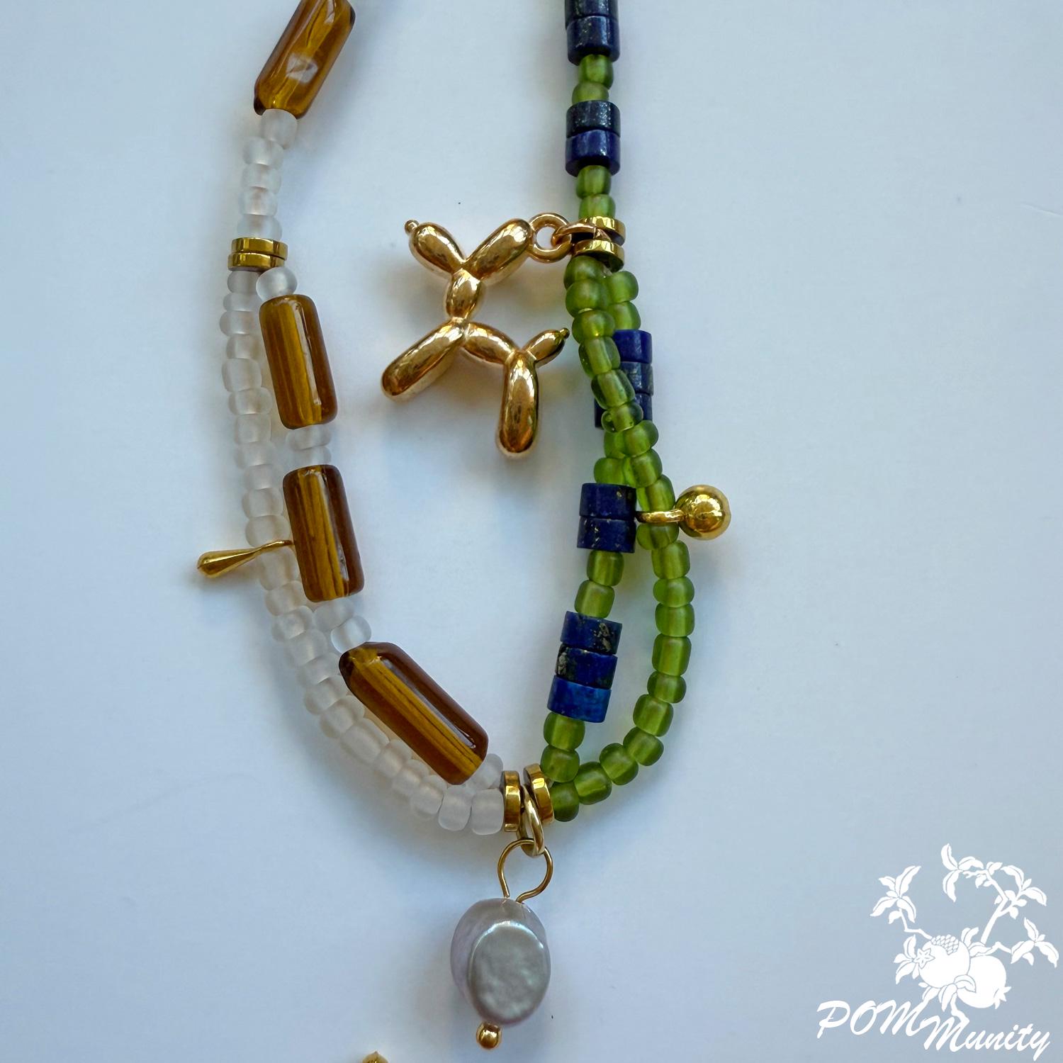 This handmade bracelet brings together natural lapis lazuli, freshwater pearls, transparent glass, and shell beads, accented with a golden balloon dog charm for a touch of humor and charm.