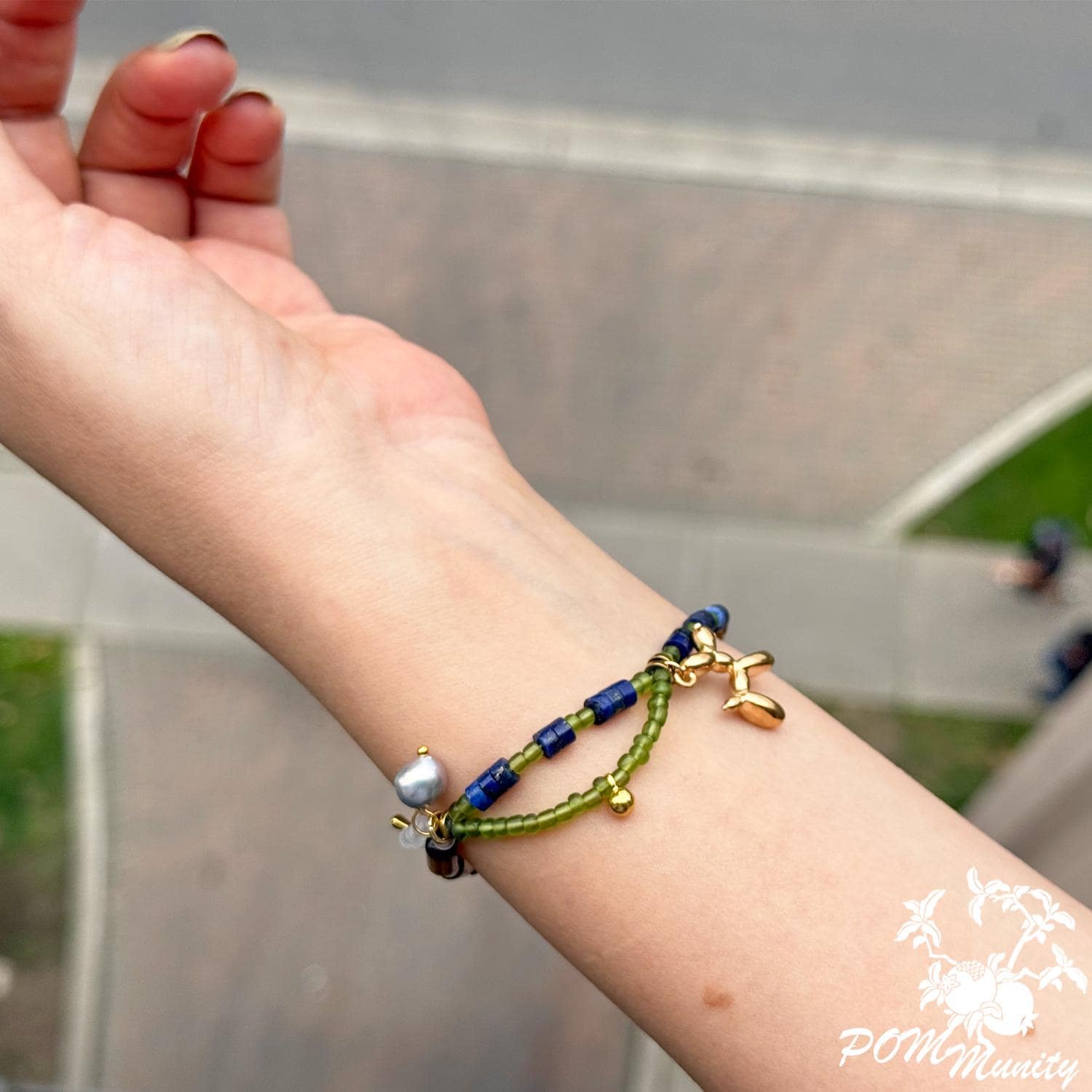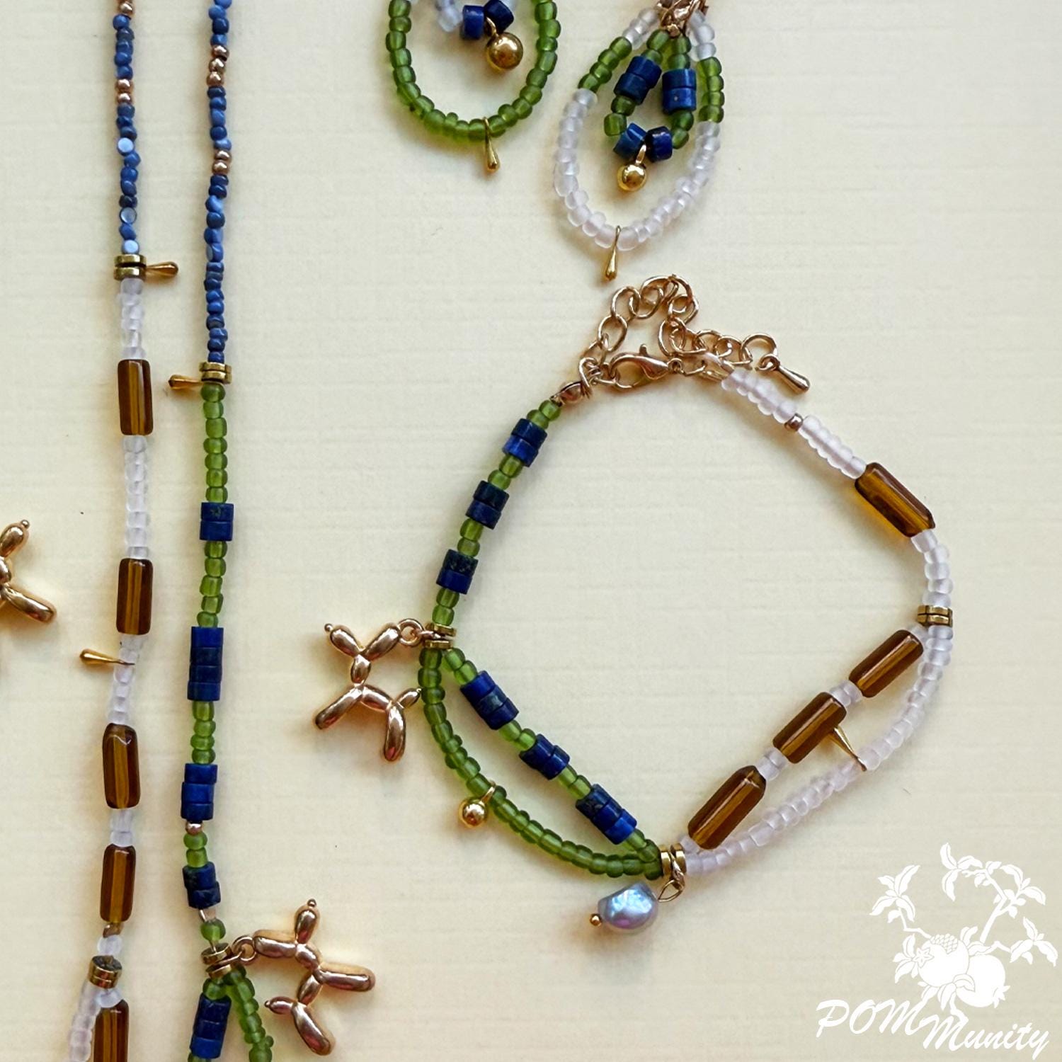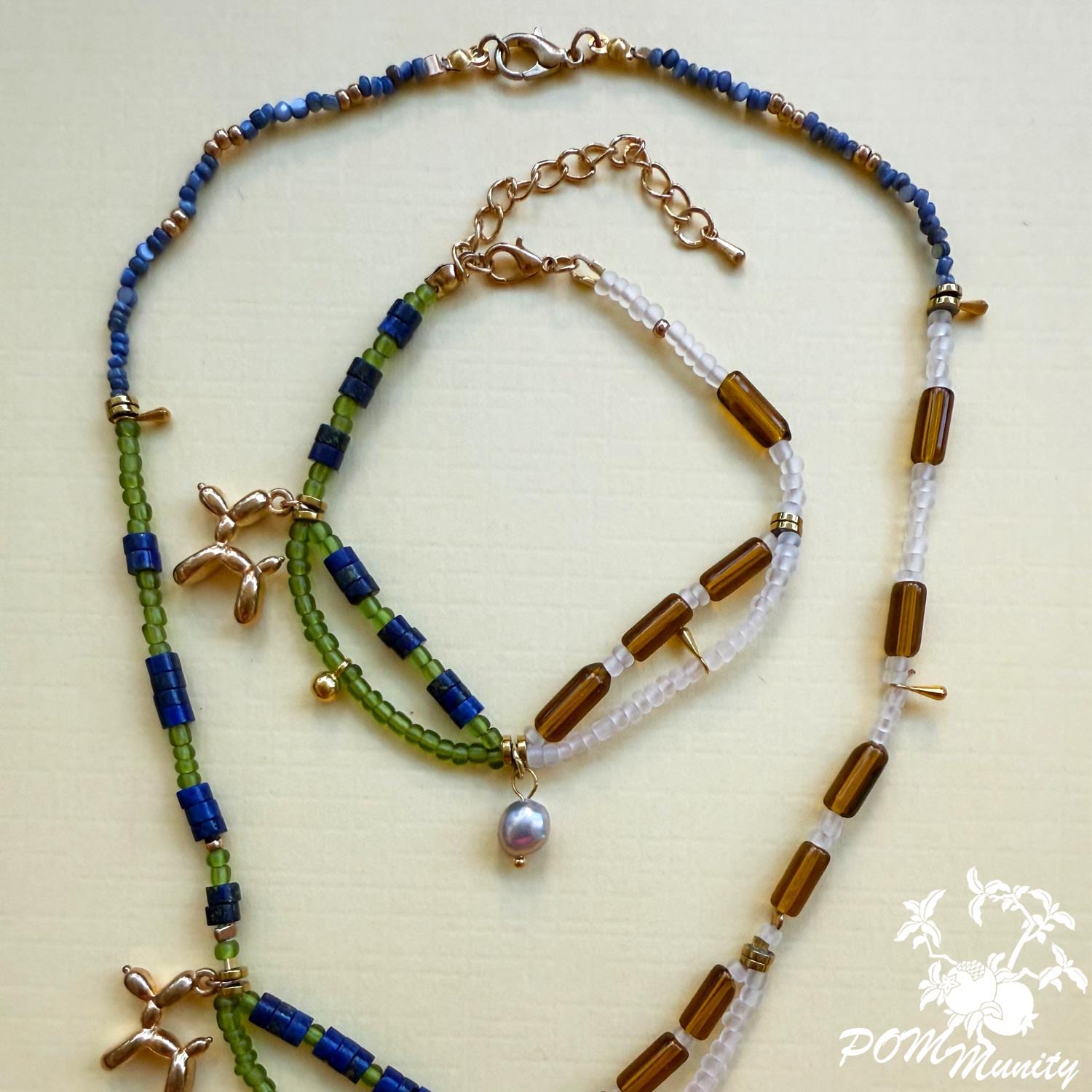 This handmade bracelet brings together natural lapis lazuli, freshwater pearls, transparent glass, and shell beads, accented with a golden balloon dog charm for a touch of humor and charm.