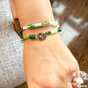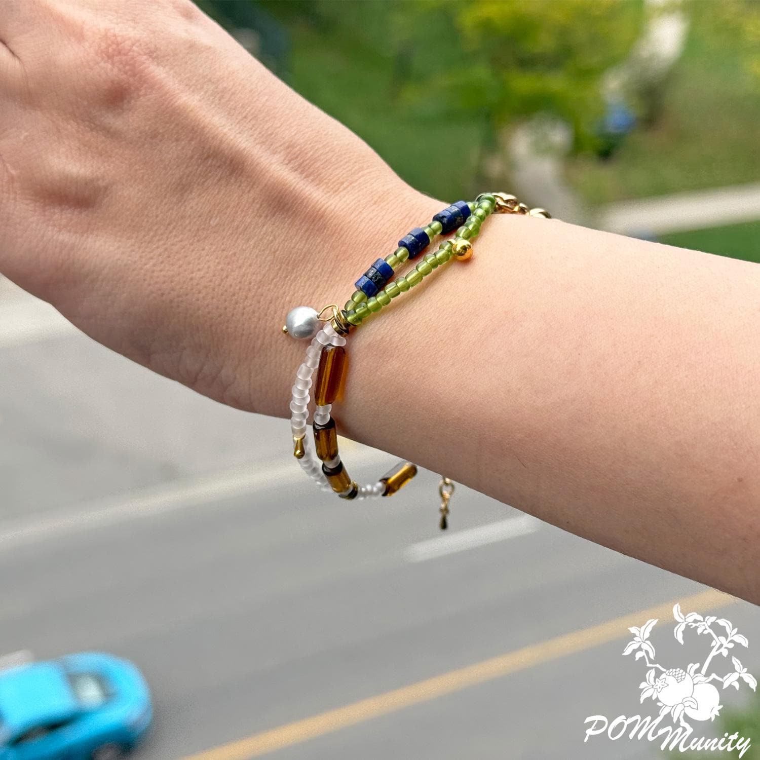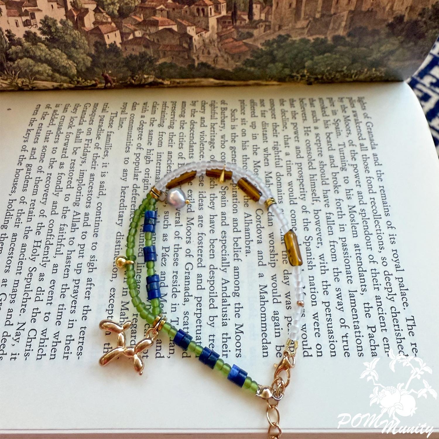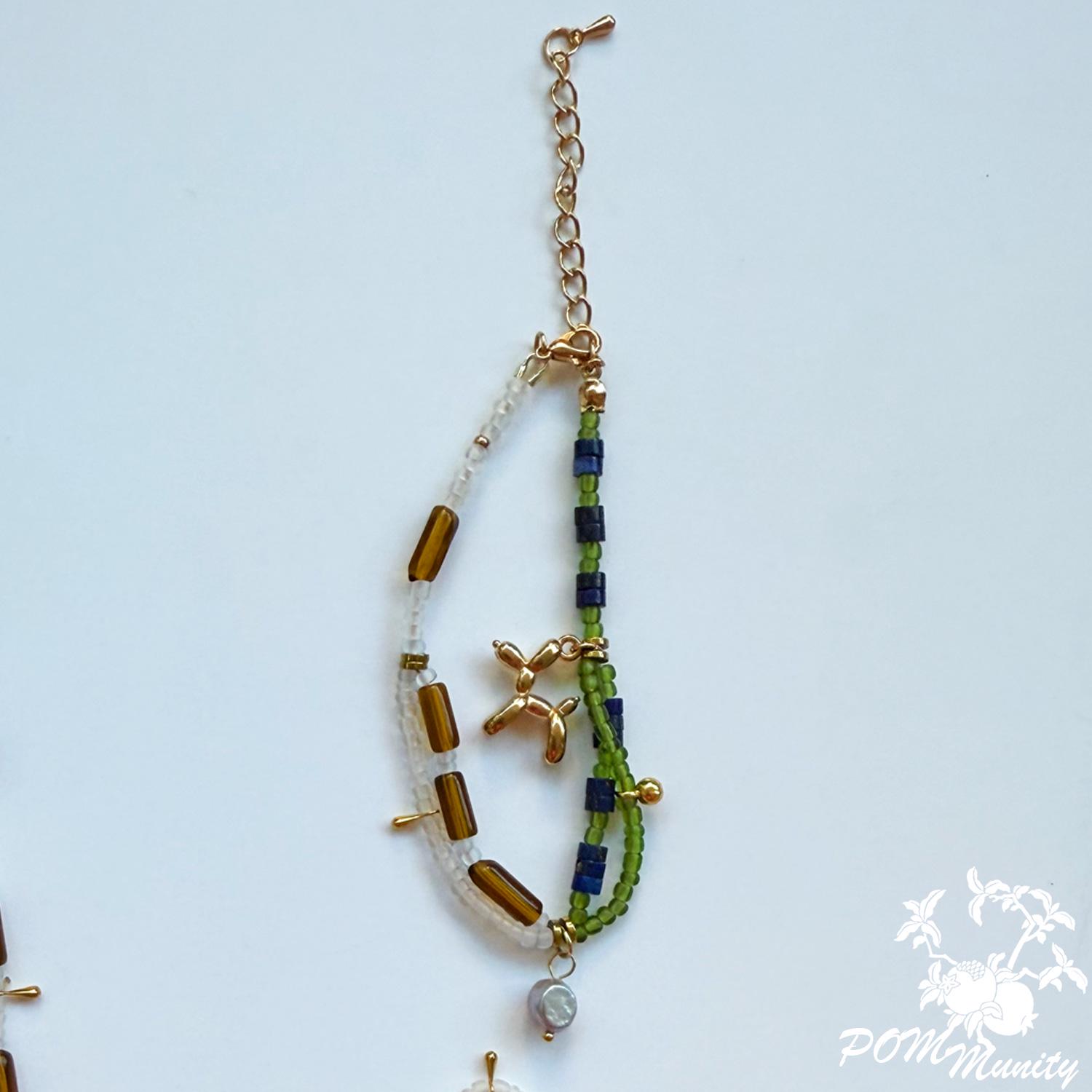 The mix of green, blue, and golden tones creates a refreshing design that pairs perfectly with the matching necklace and earrings or stands beautifully on its own.