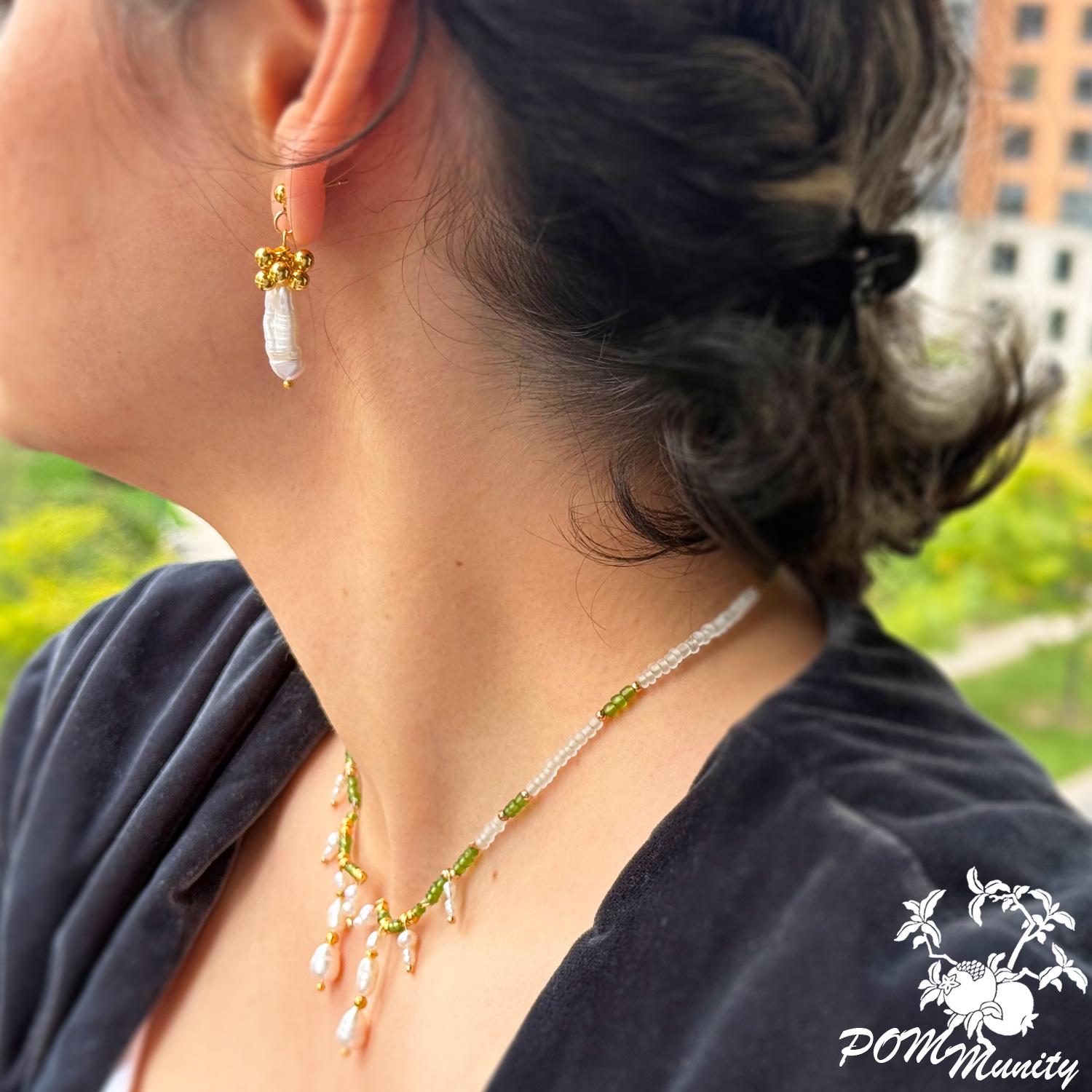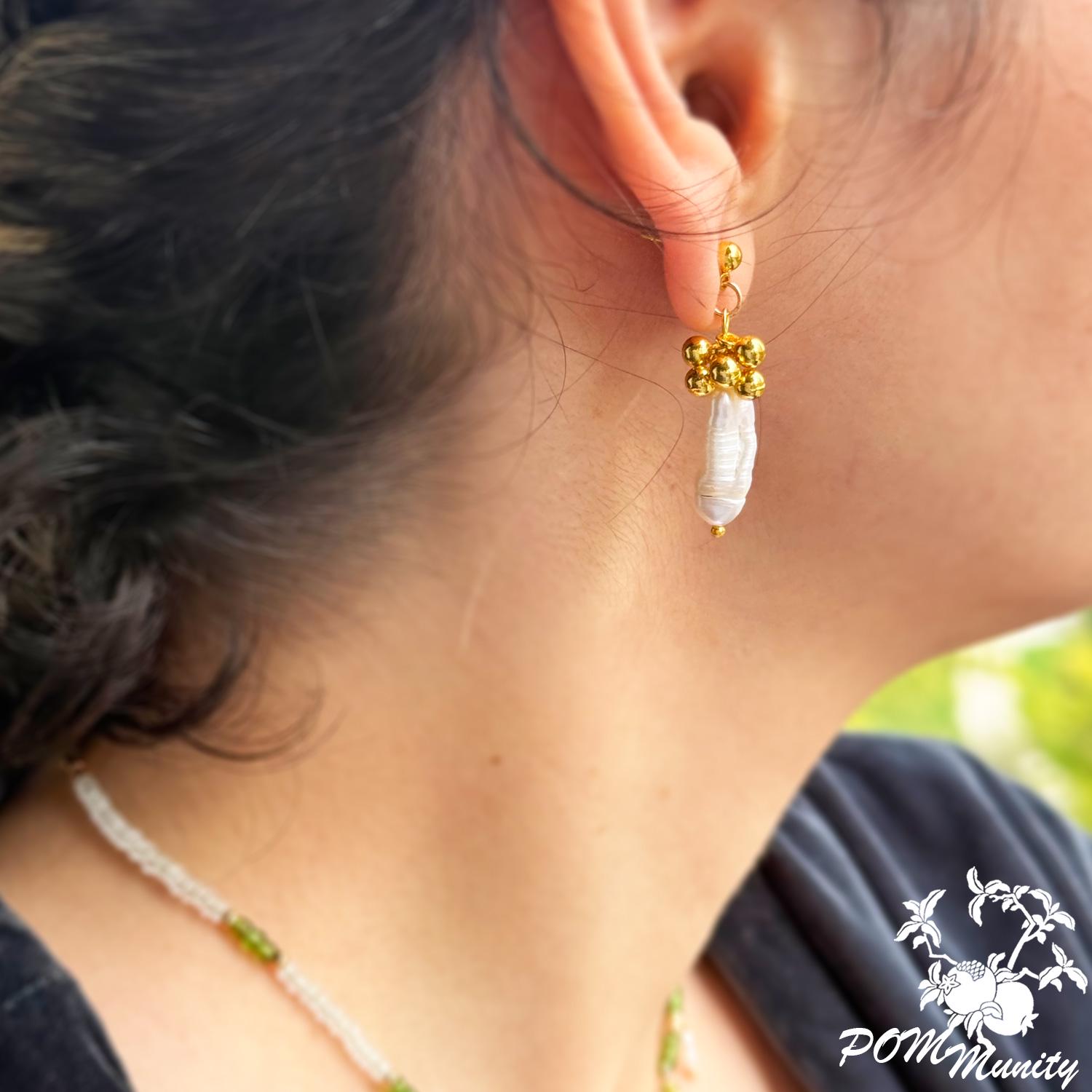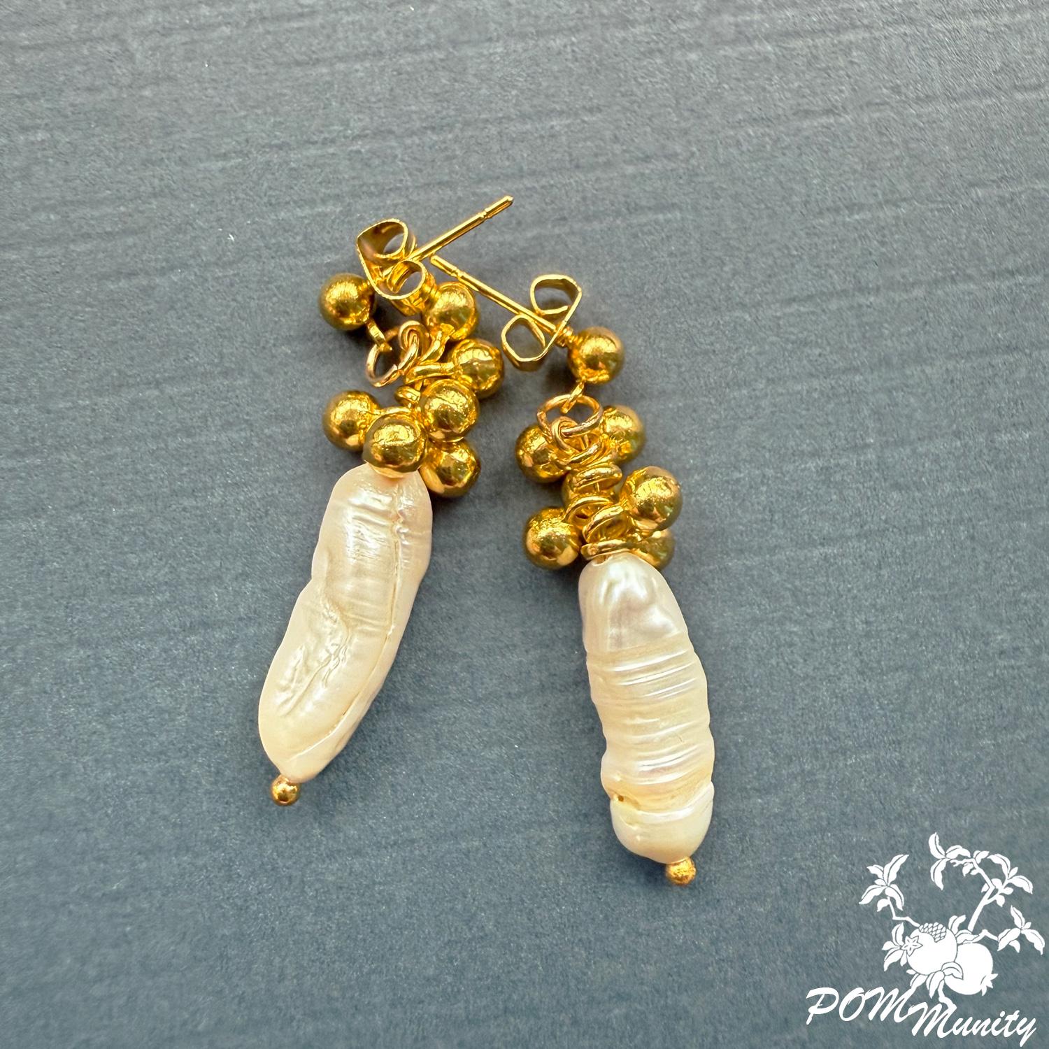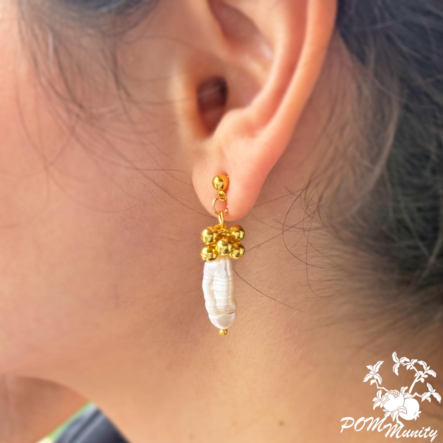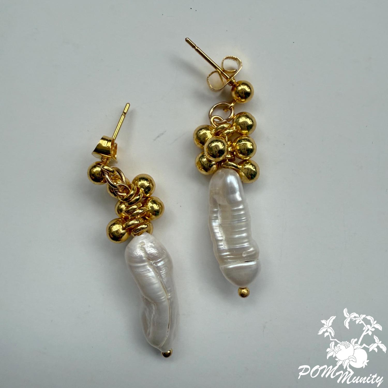 These handmade earrings combine natural freshwater baroque pearls with golden spherical charms, creating a modern and elegant silhouette. Each earring features an organic pearl drop suspended from a cluster of gold-toned beads, offering texture, balance, and subtle luxury.