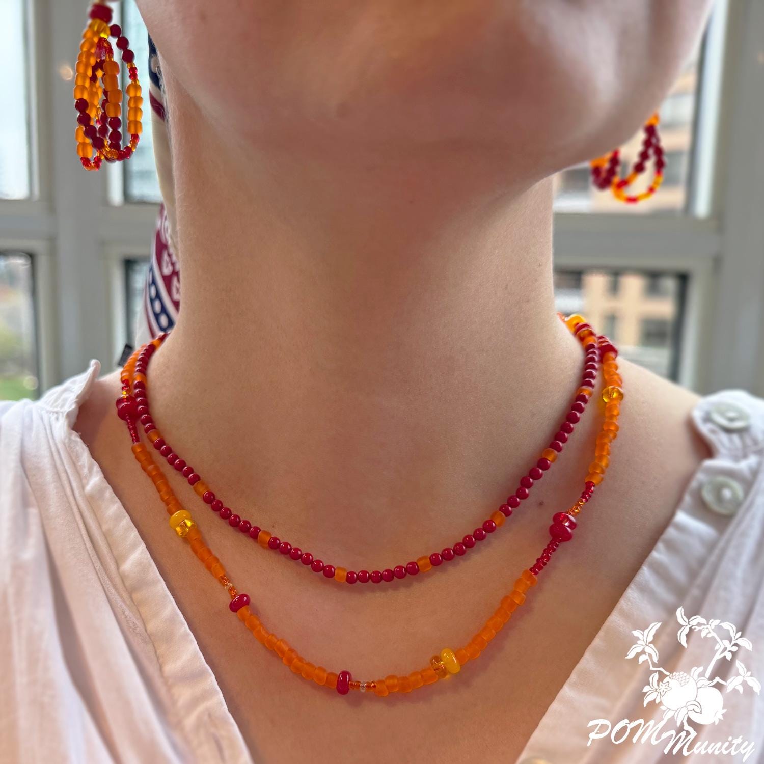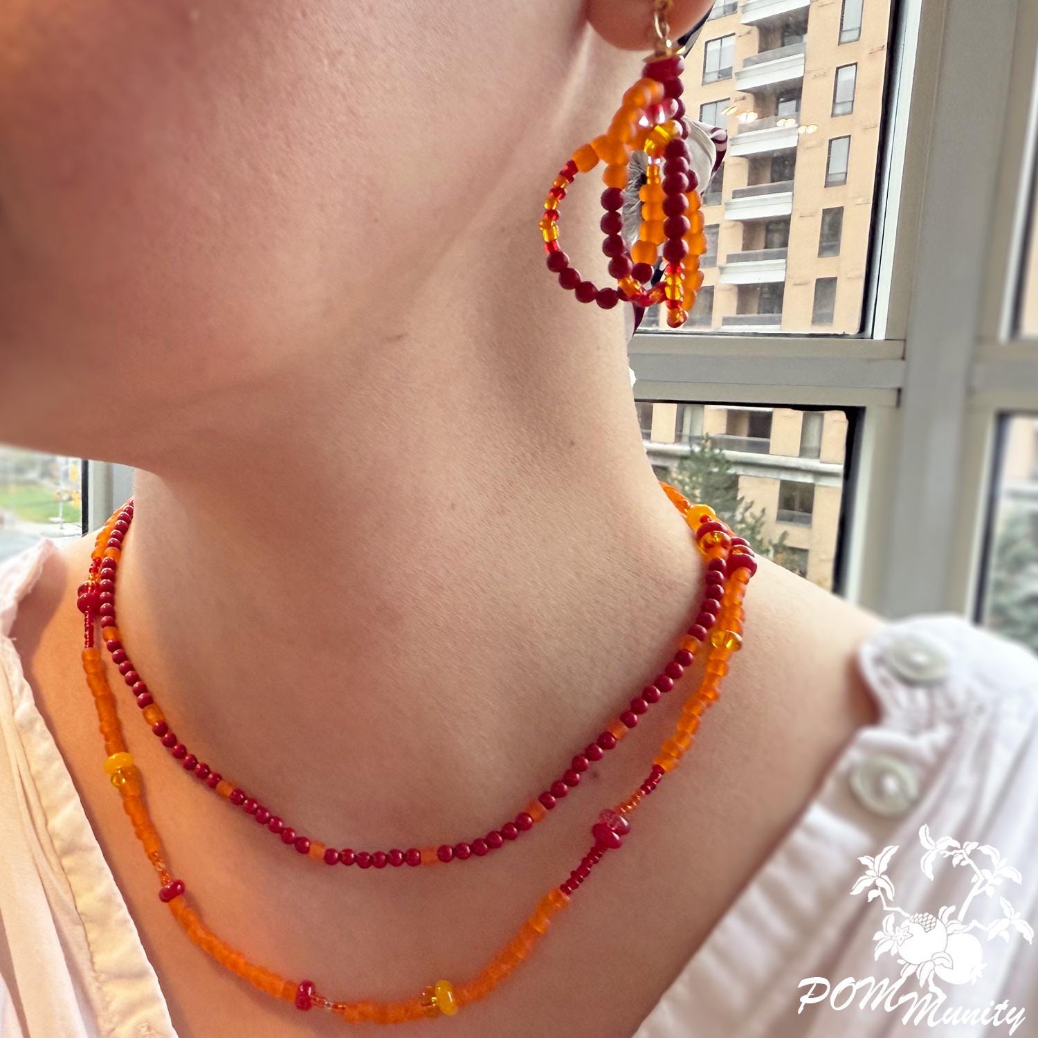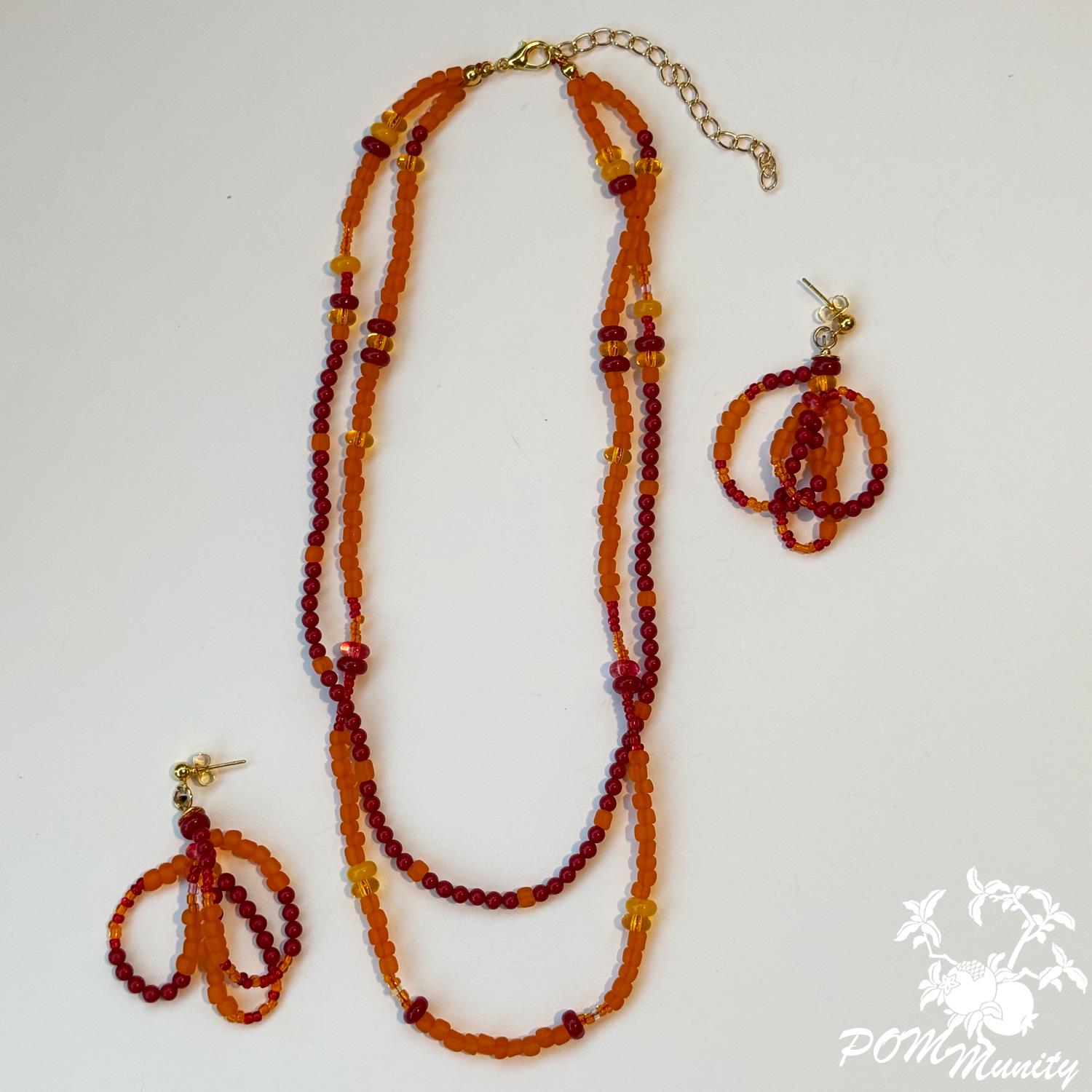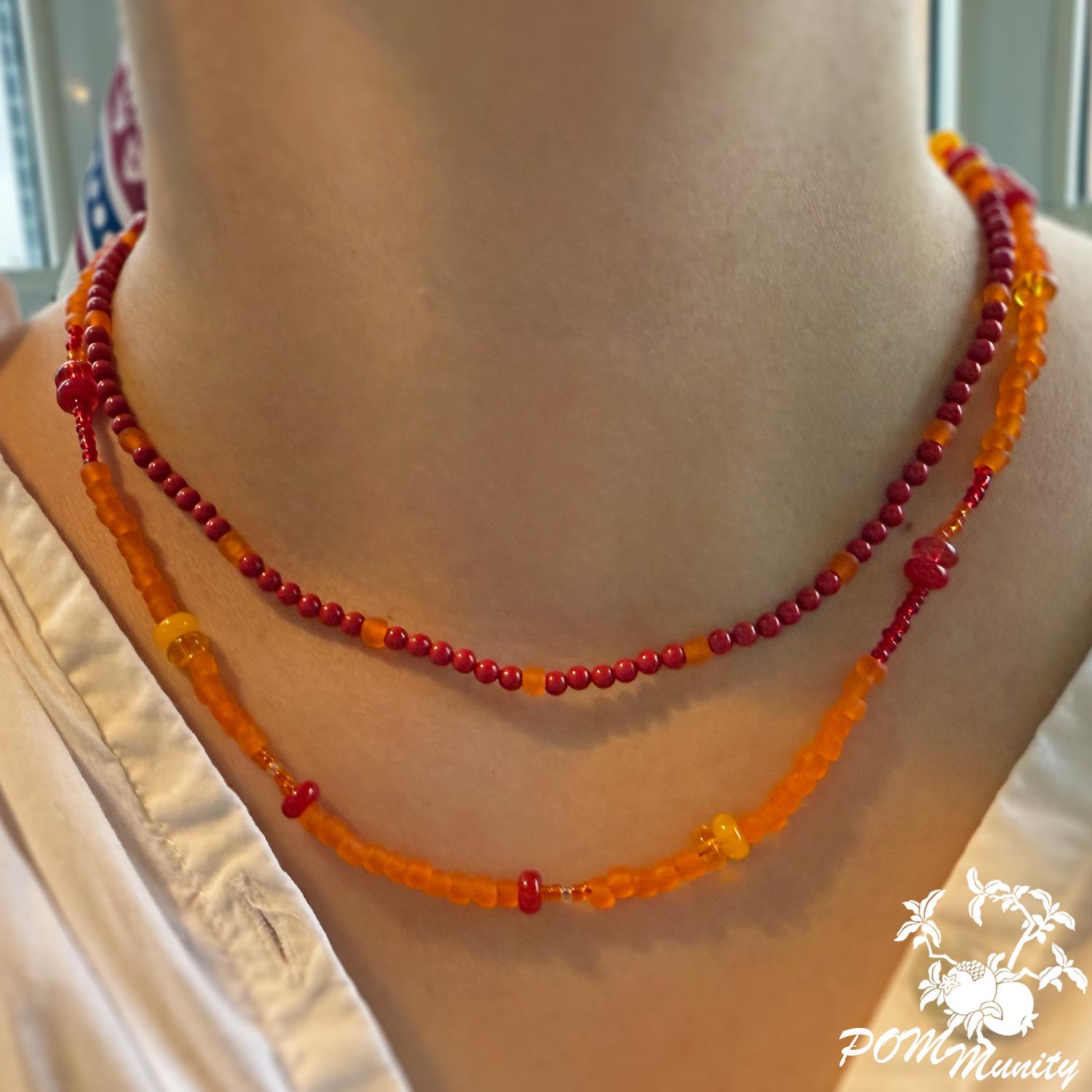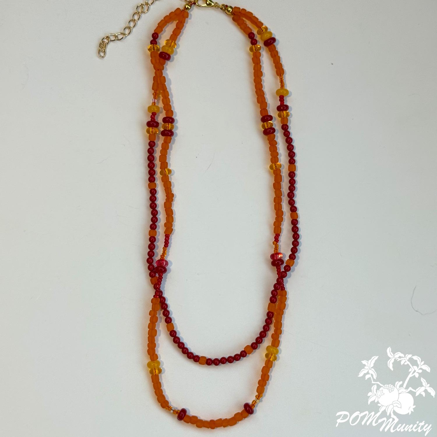 A radiant handmade necklace combining natural coral beads with frosted and clear glass seed beads in shades of red and orange. The layered strands create a warm, glowing effect — inspired by sunset tones and carefree summer days.