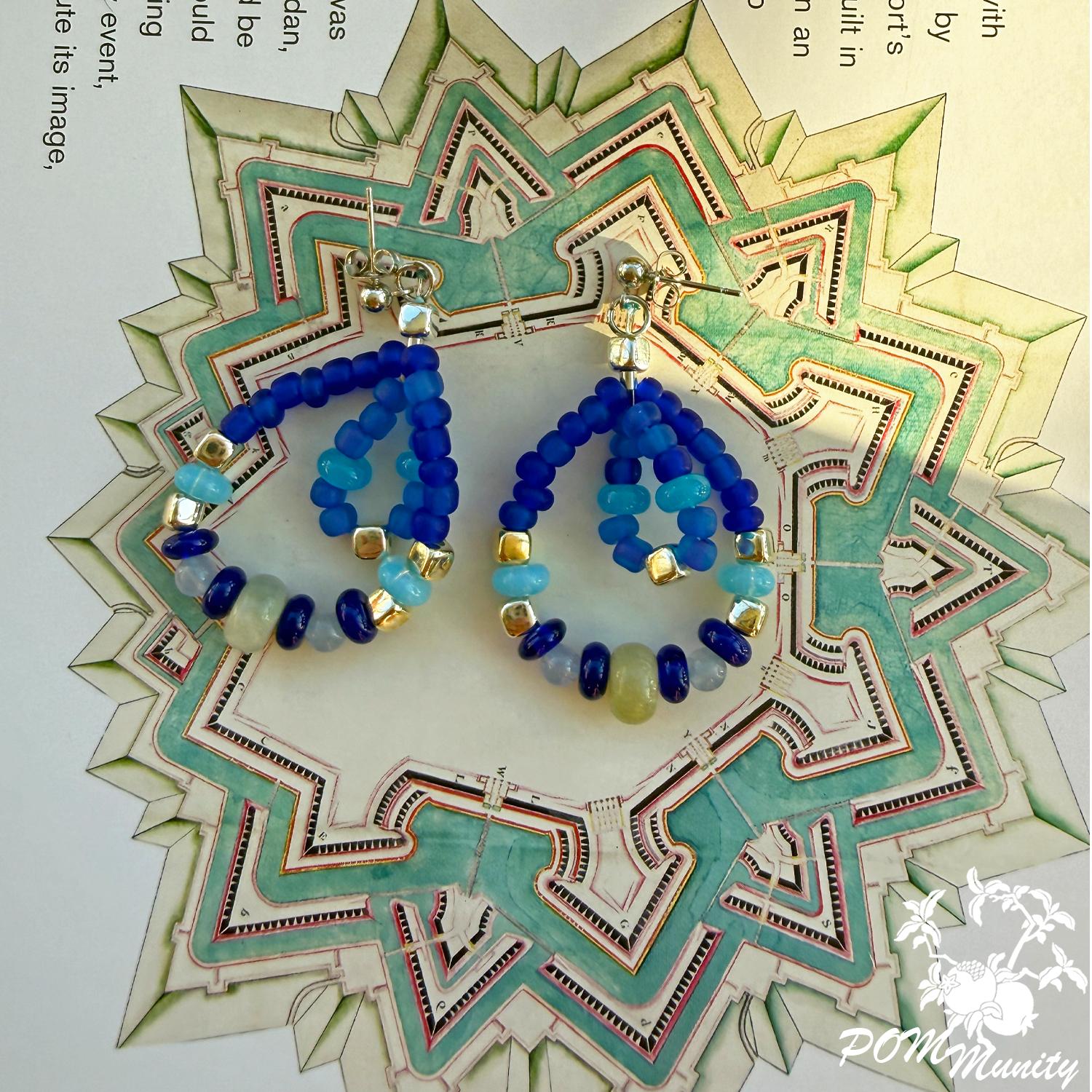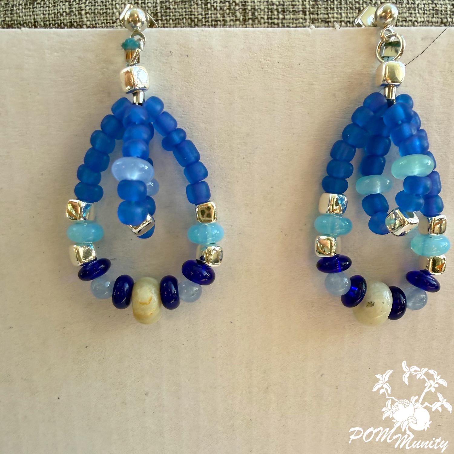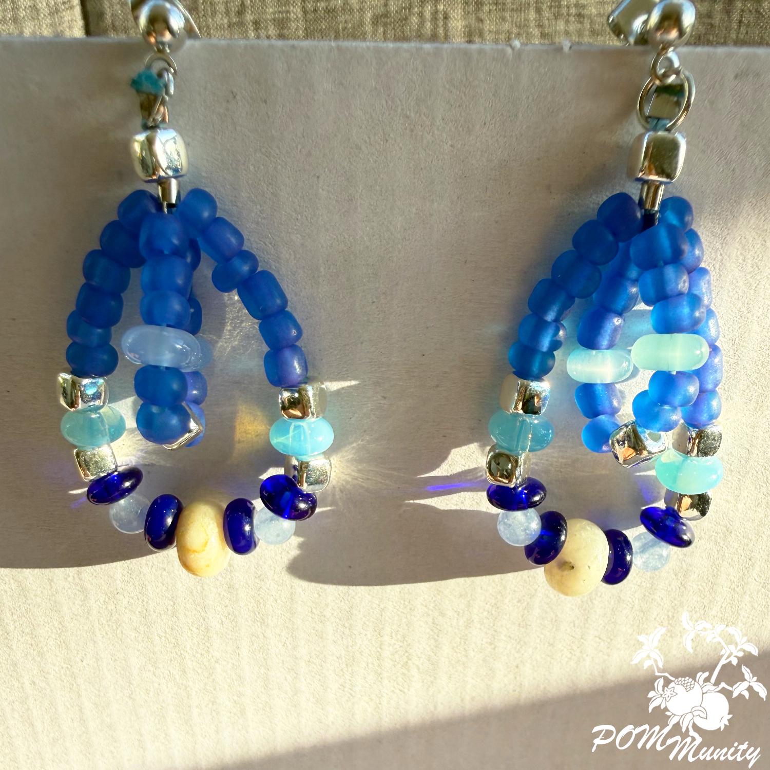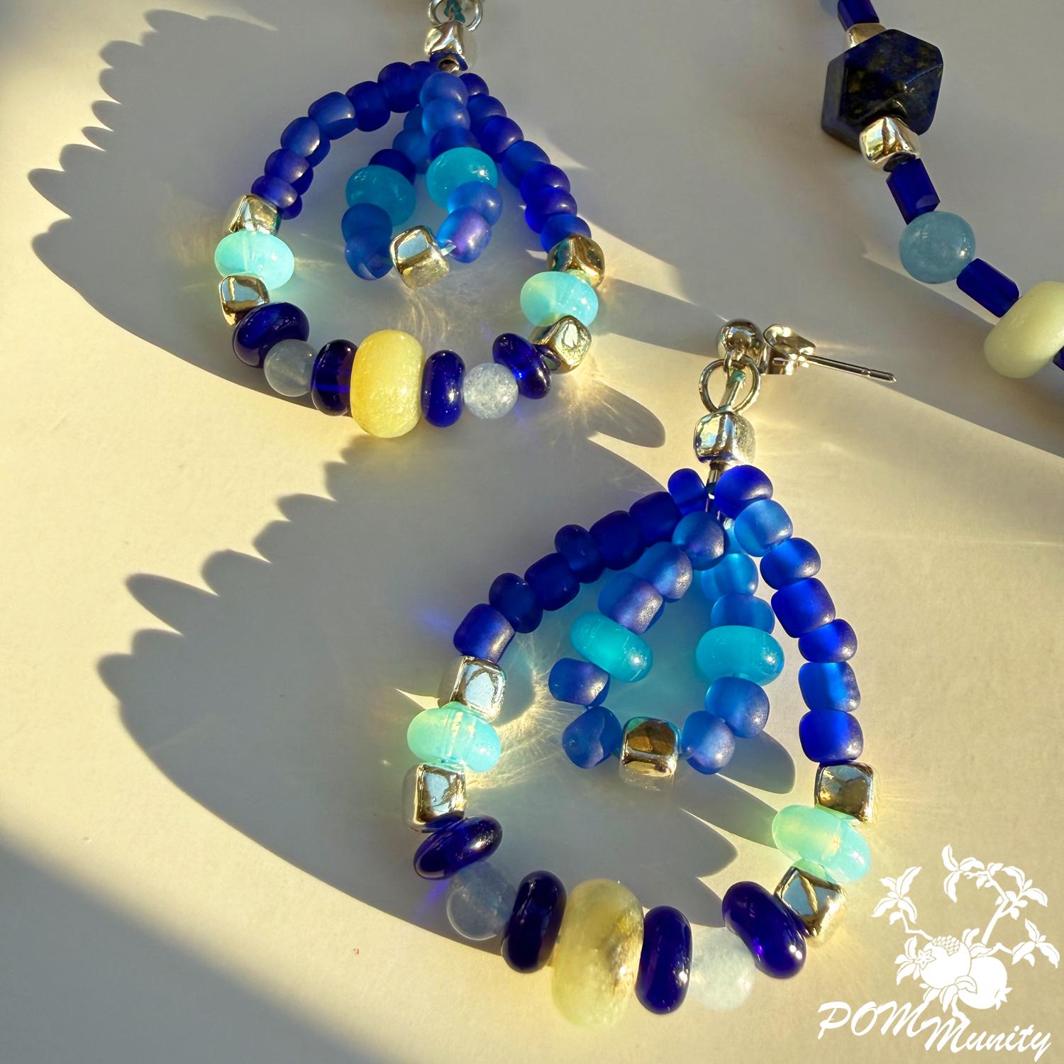 These handmade earrings are a harmonious mix of deep cobalt, aqua, and soft sea-glass blues, inspired by waves meeting the horizon. Featuring lapis accents with aquamarine chalcedony and translucent blue glass beads, this pair blends bold color with delicate structure.