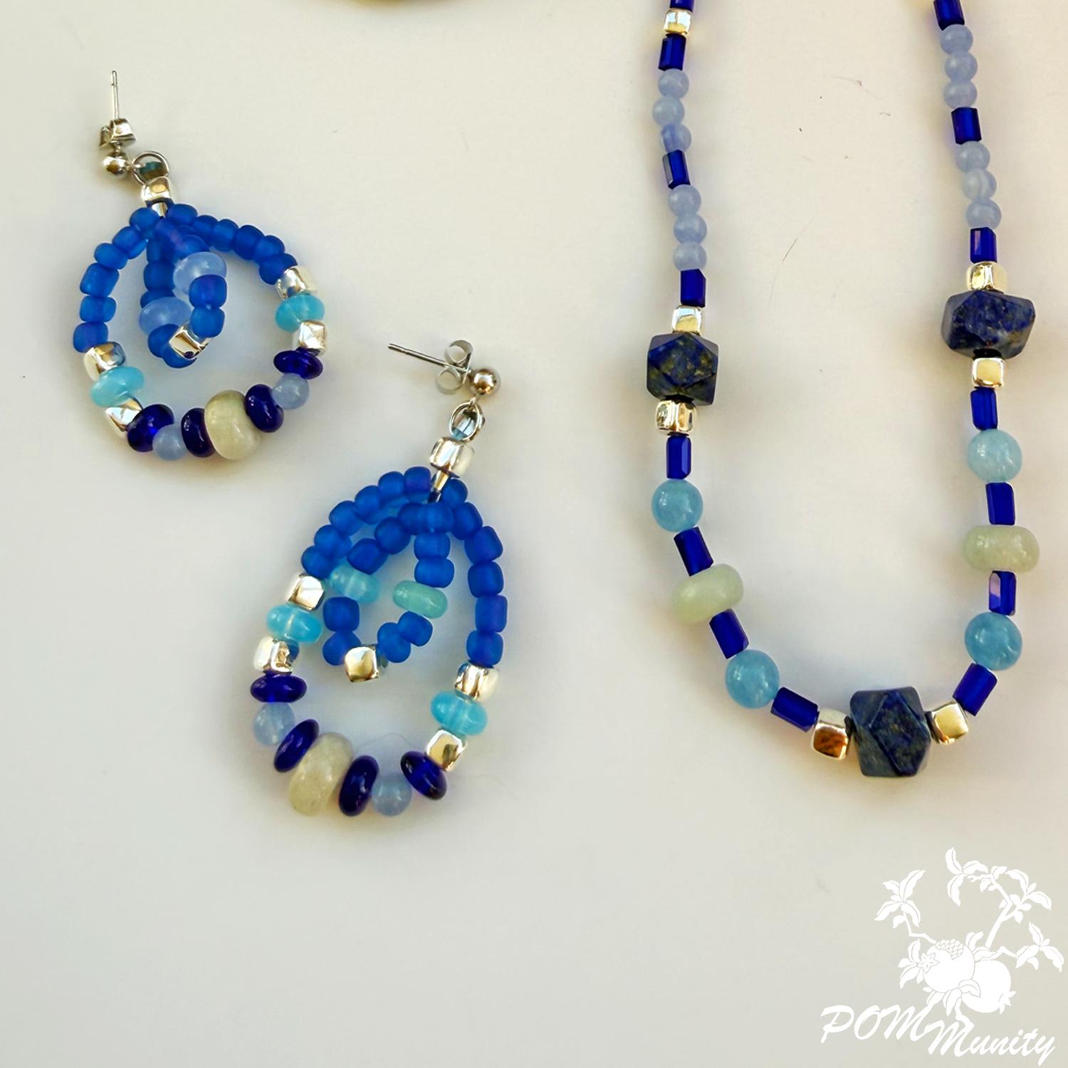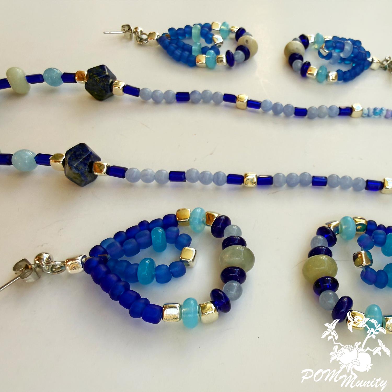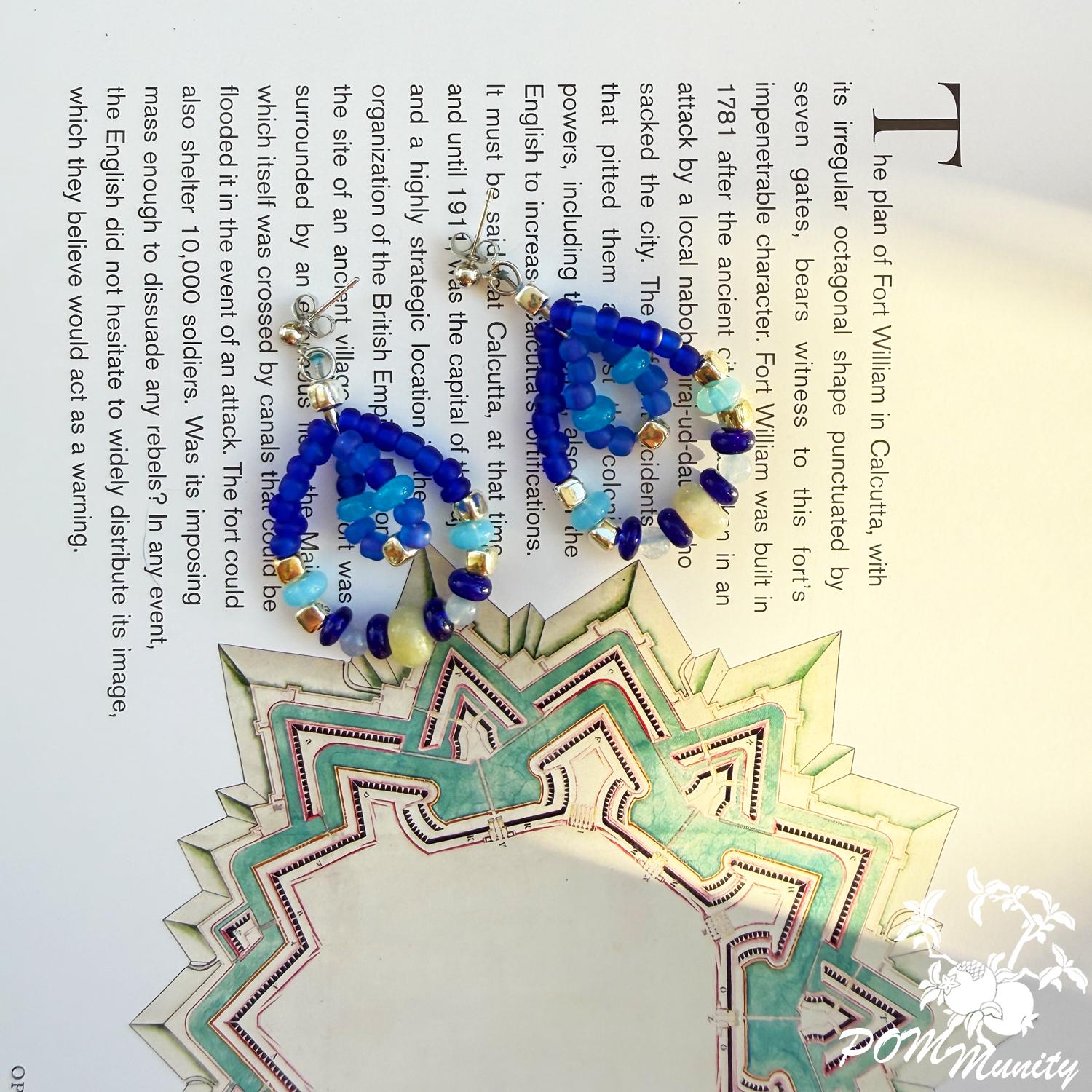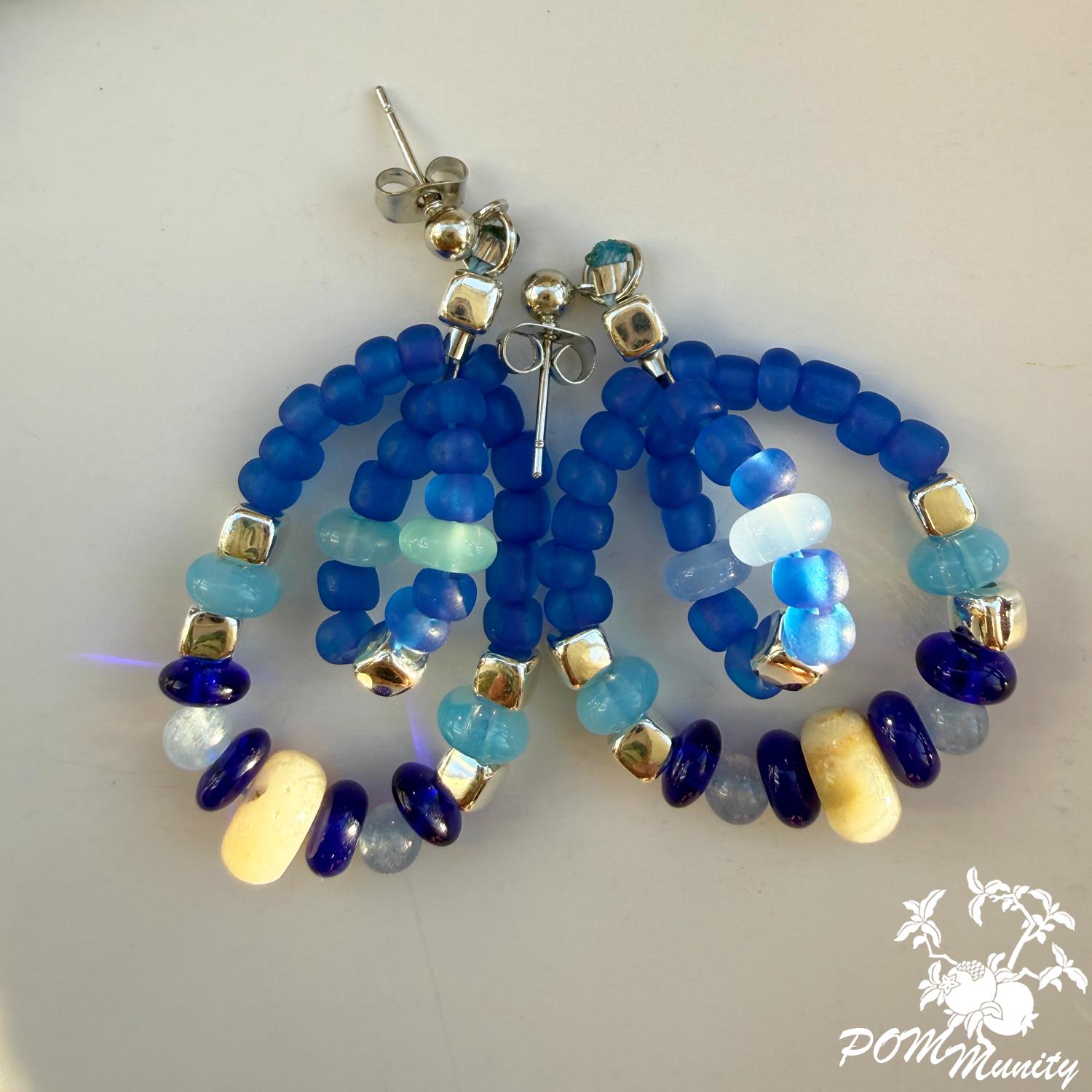 These handmade earrings are a harmonious mix of deep cobalt, aqua, and soft sea-glass blues, inspired by waves meeting the horizon. Featuring lapis accents with aquamarine chalcedony and translucent blue glass beads, this pair blends bold color with delicate structure.