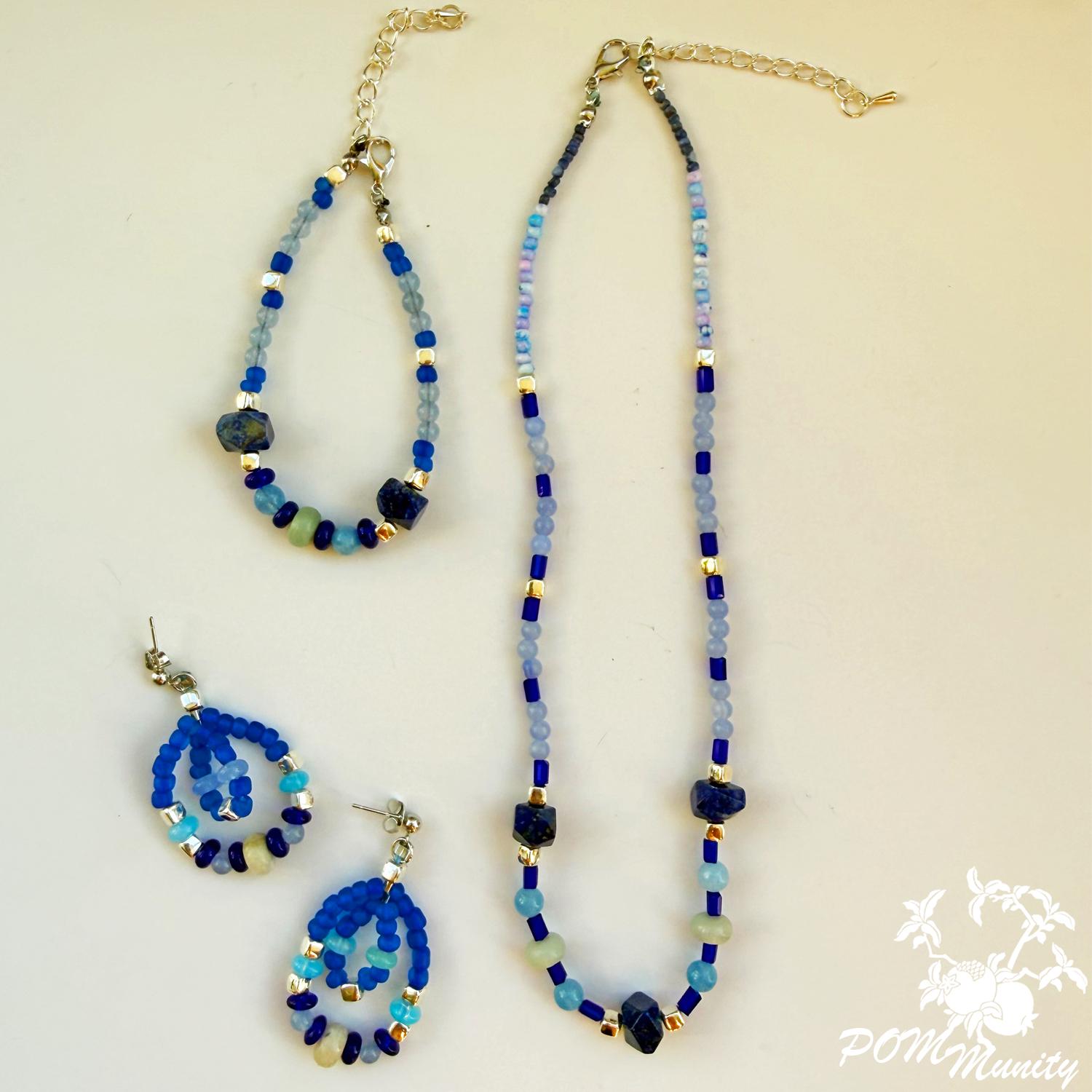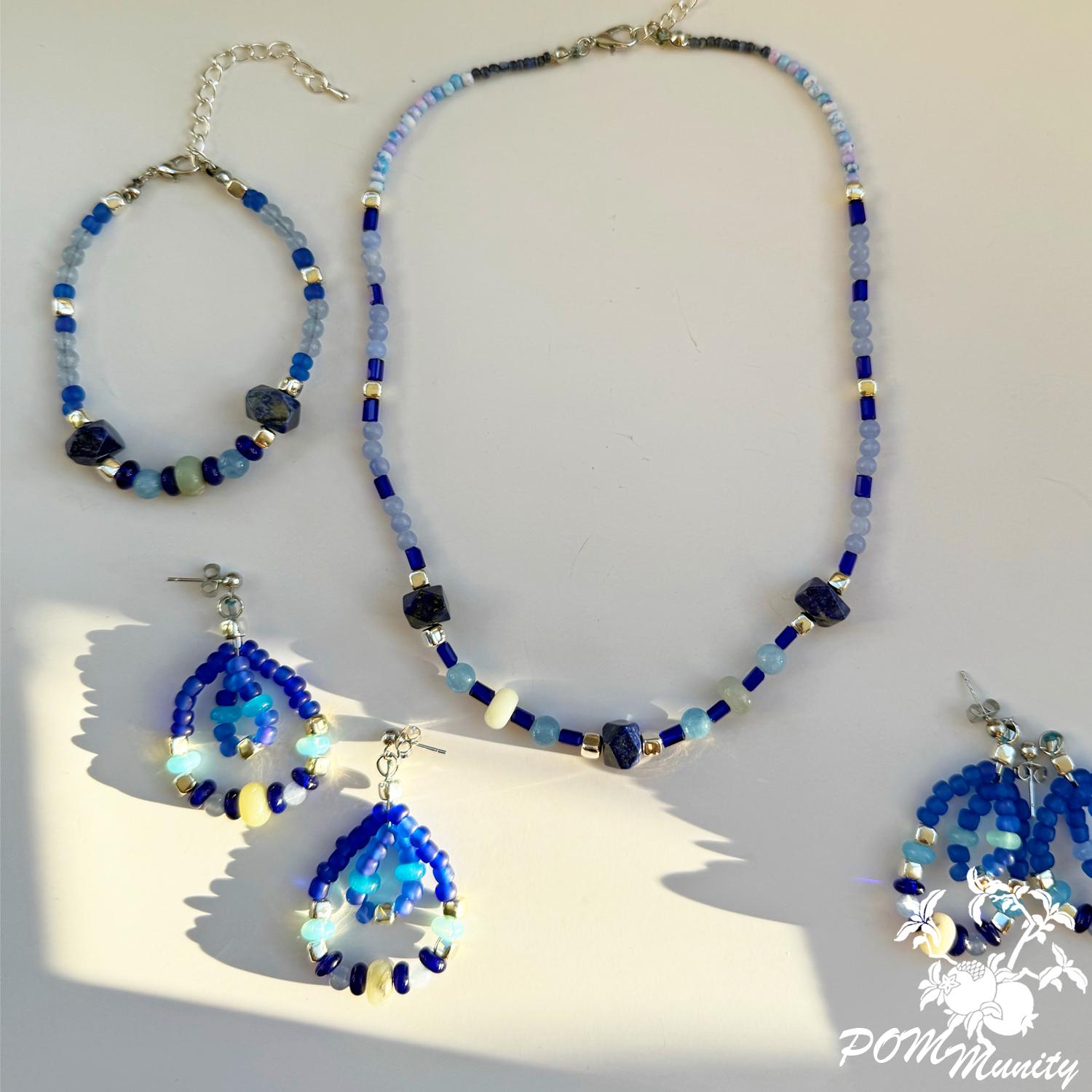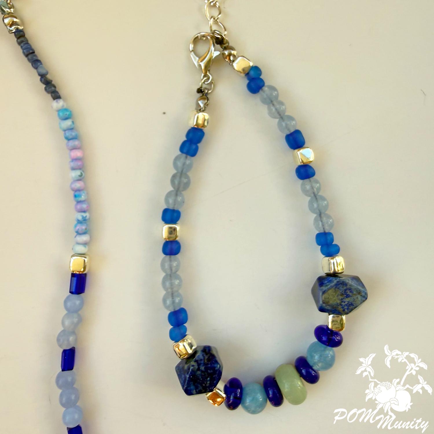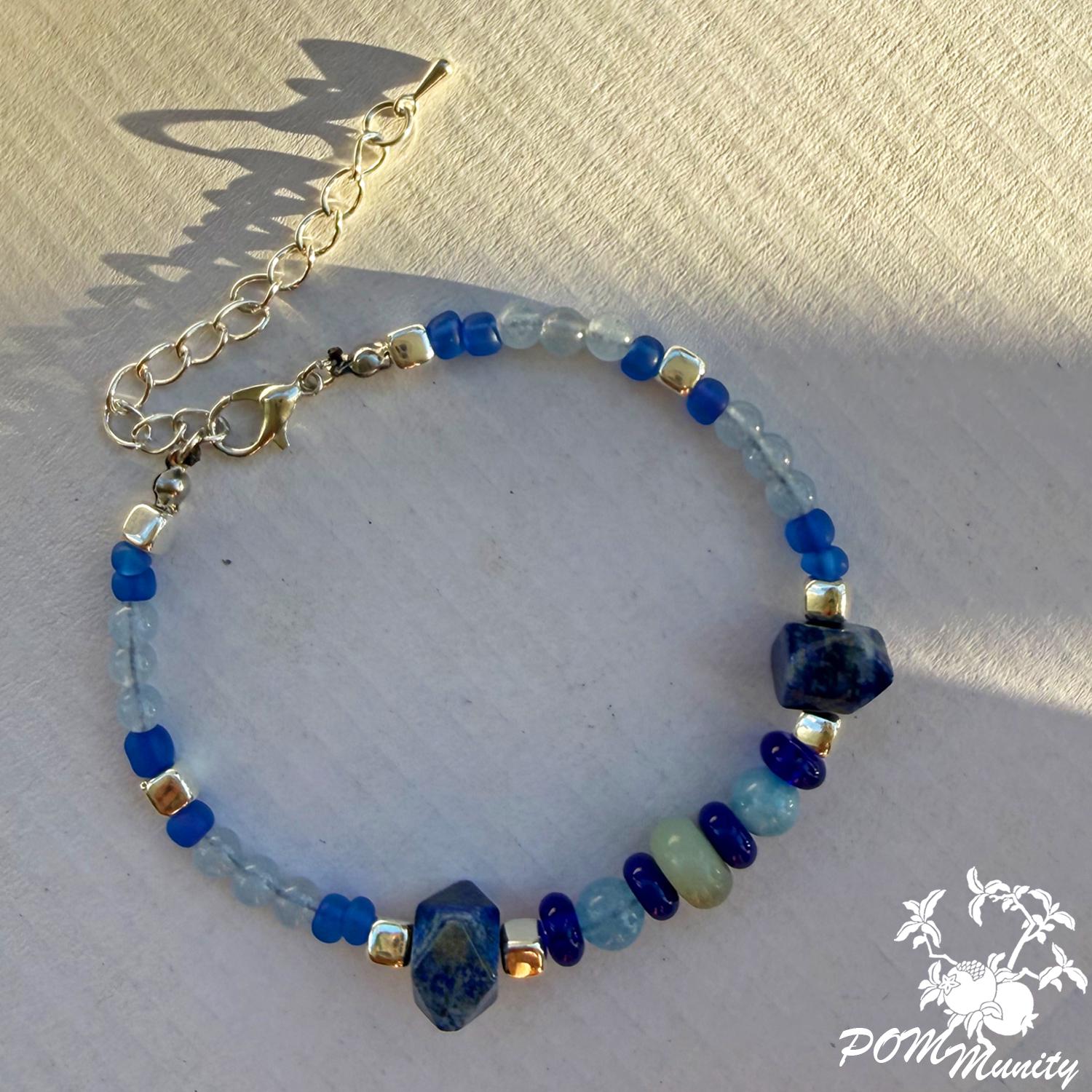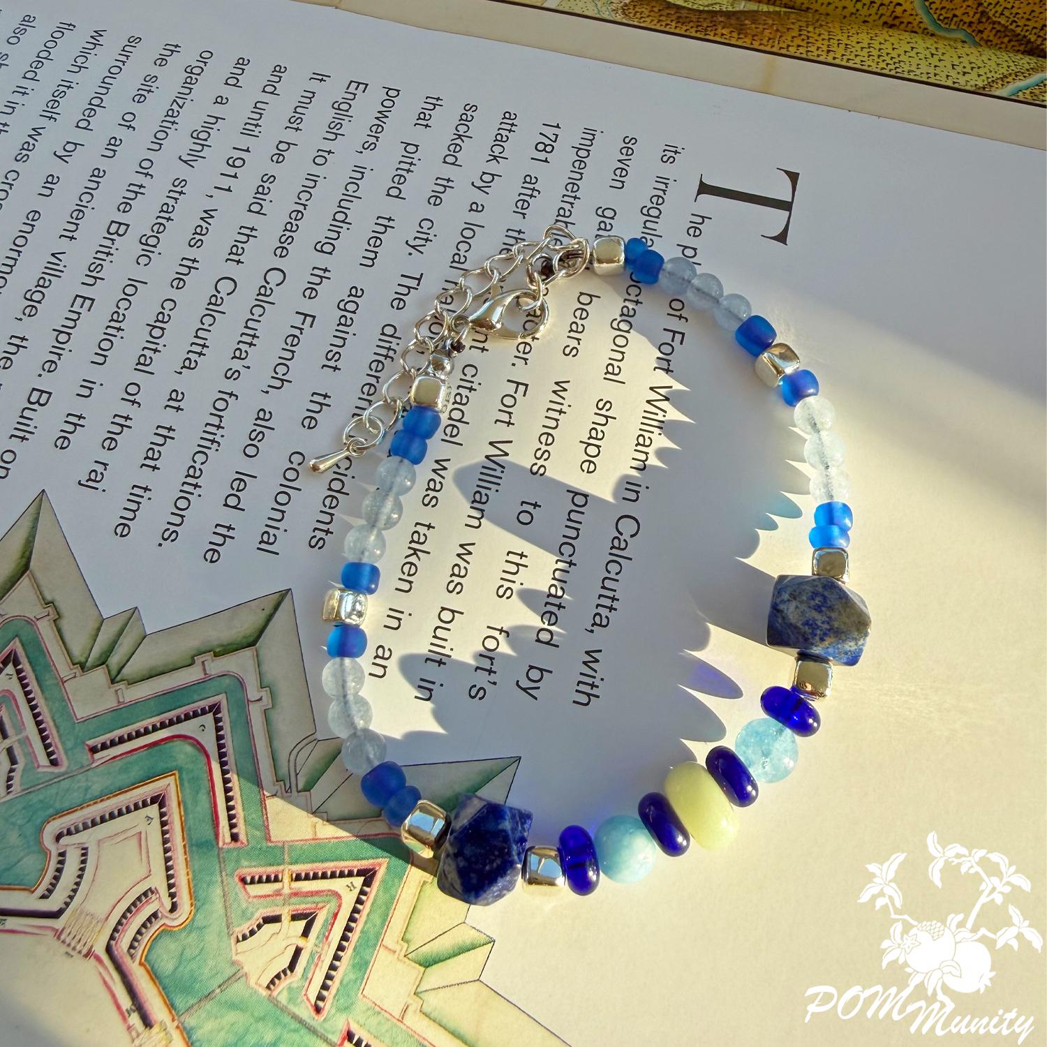 This handmade bracelet is a delicate reflection of deep ocean blues and soft coastal light, inspired by waves, smooth stones, and shifting sea tones. Featuring lapis lazuli stone spacer beads paired with aquamarine chalcedony and aquamarine round stone beads, this piece blends richness and clarity in a balanced, elegant design.